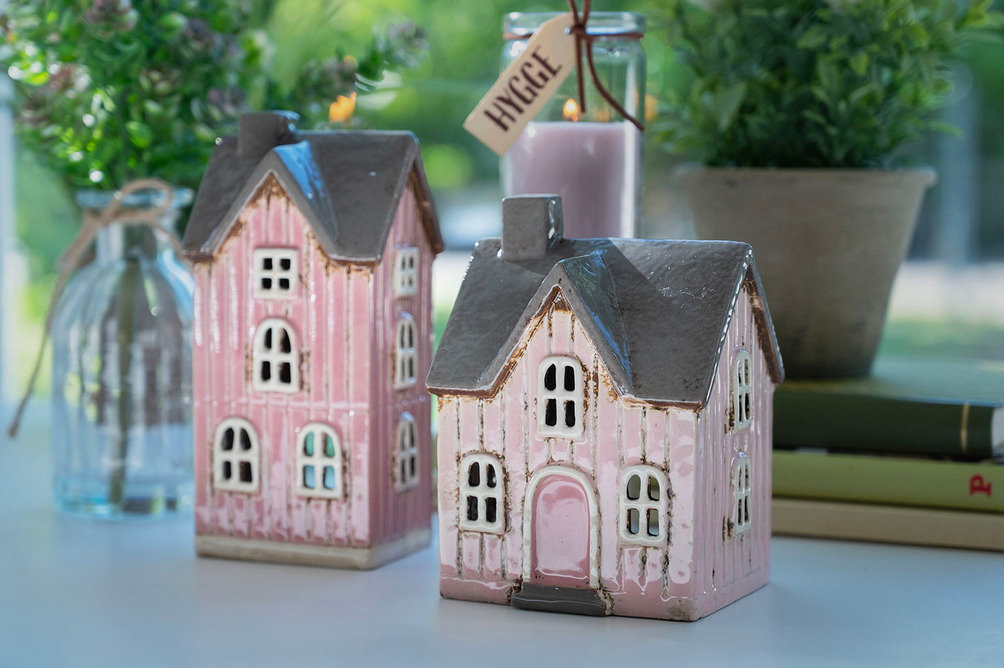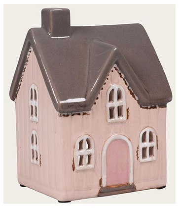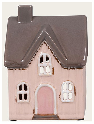 Detta rosa hus har ett mjukt och inbjudande uttryck med sin pastellfärgade fasad, klassiska paneler och sitt matta grå tak. De rundade fönstren och den böjda dörren ger huset en varm och hemtrevlig känsla. Den glaserade keramiken gör det dekorativt även när det inte lyser. Huset är avsett för värmeljus men fungerar lika fint med en liten ljusslinga för att skapa ett mjukt och behagligt sken. En söt och stämningsfull detalj som passar i alla rum under hela året.