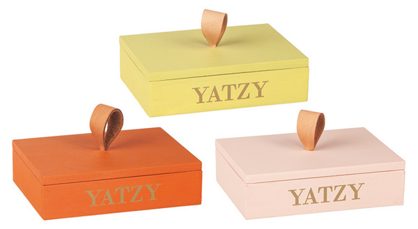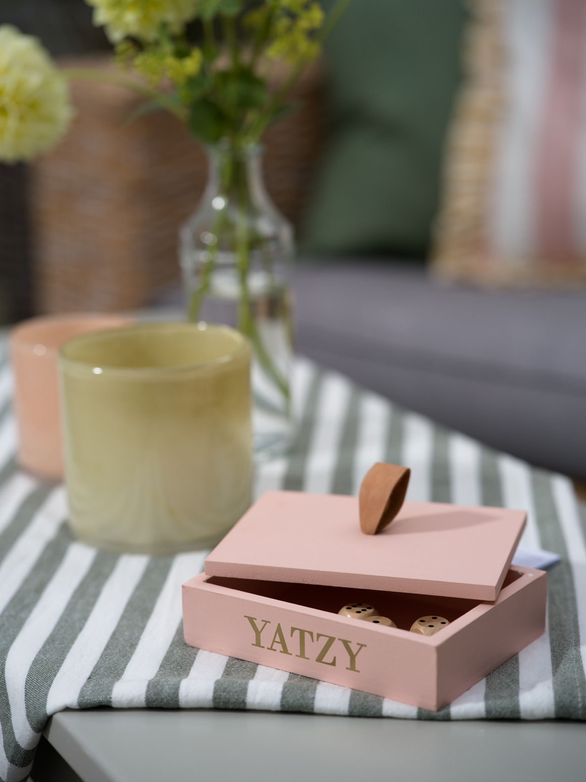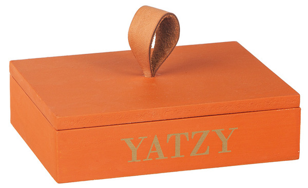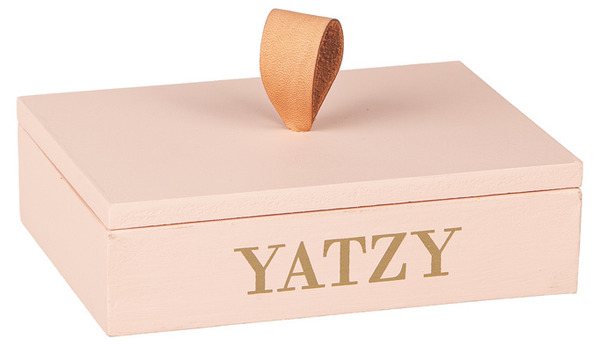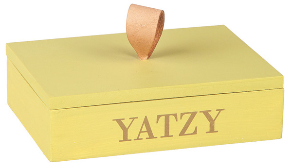 Ett klassiskt Yatzy-spel i stilren och dekorativ förpackning. Den rektangulära träasken har ett lock med läderögla och guldfärgad text på framsidan – lika fin att låta stå framme som att plocka fram till spelkvällen.