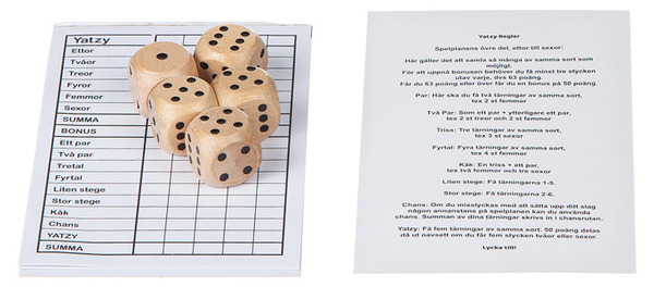 Spelet innehåller fem tärningar, poängblock och spelregler, så du har allt som behövs för en rolig stund med familj och vänner. När omgången är slut förvaras allt smidigt i asken.