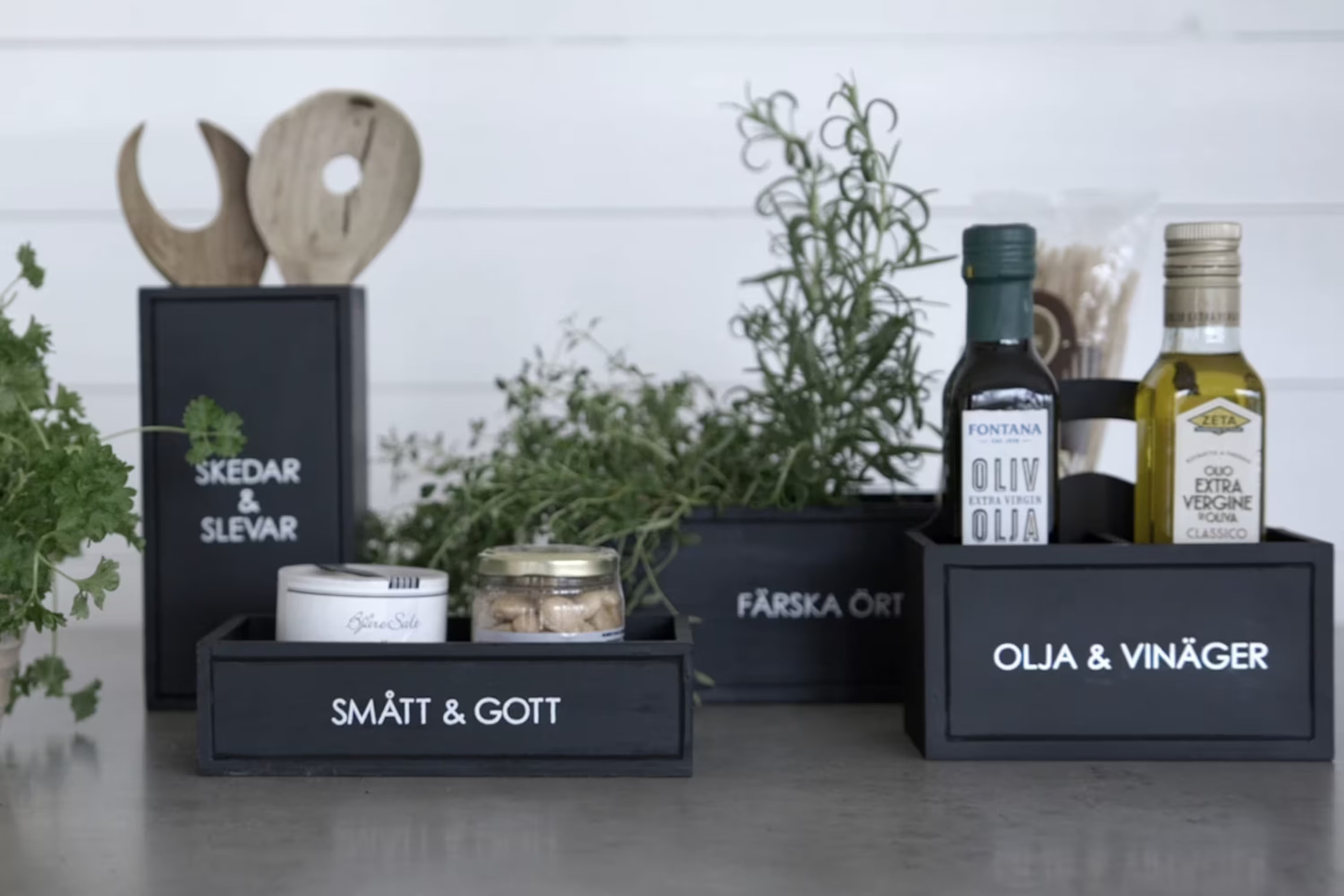 Svart förvaringslåda med handtag, plats för 2 stycken flaskor. Text: Olja & Vinäger. Läs mer