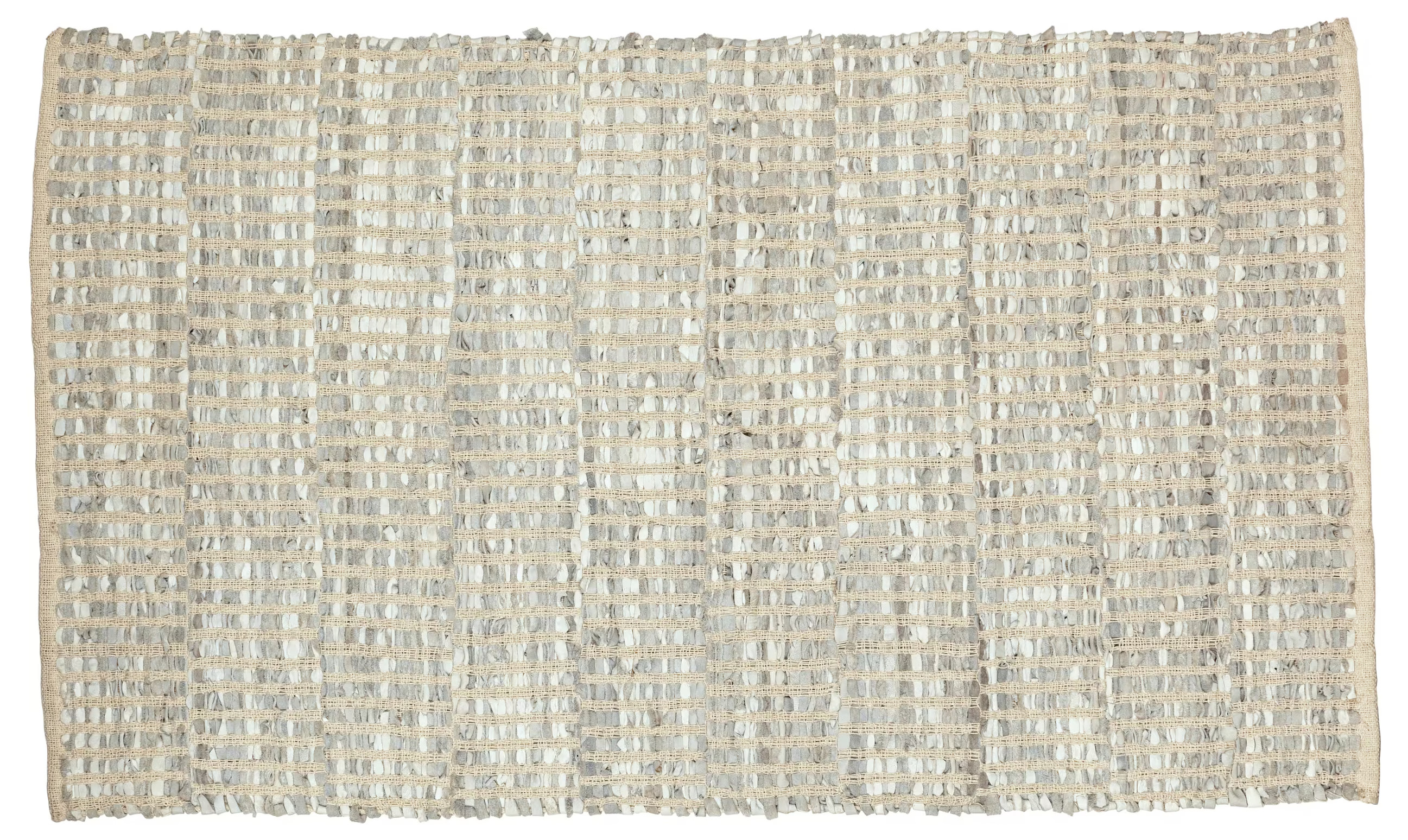 Vändbar trasmatta av återvunnet läder. 70% läder, 30% bomull.