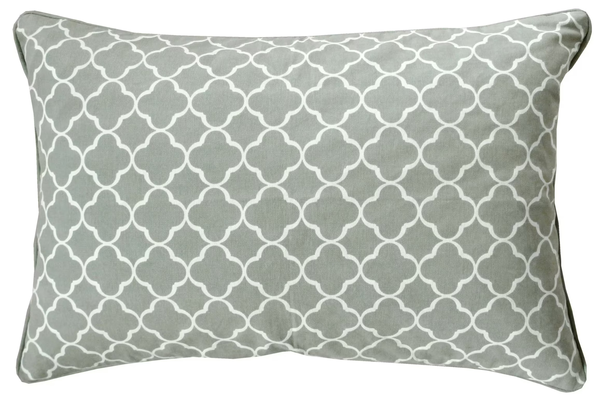 Färgen på kuddfodralet är en mjuk och behaglig celadony, en dämpad grön nyans som kan ge en avslappnande känsla till rummet. Det geometriska mönstret består av regelbundet återkommande, vita linjer som bildar ett vackert och symmetriskt mönster mot den celadongröna basen. Detta skapar en attraktiv kontrast och en visuellt tilltalande effekt.