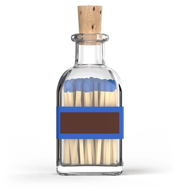 Inuti flaskan ser vi tändstickor med långa, ljusa trästickor och toppar i en mjuk blå färg som påminner om havets blå nyanser. Tändstickorna står tätt packade i flaskan, och deras toppar skapar ett enhetligt mönster mot glasets yta. Själva stickornas längd är anpassad så att de inte överstiger flaskans höjd, vilket gör att de omsluts perfekt av glasbehållaren.