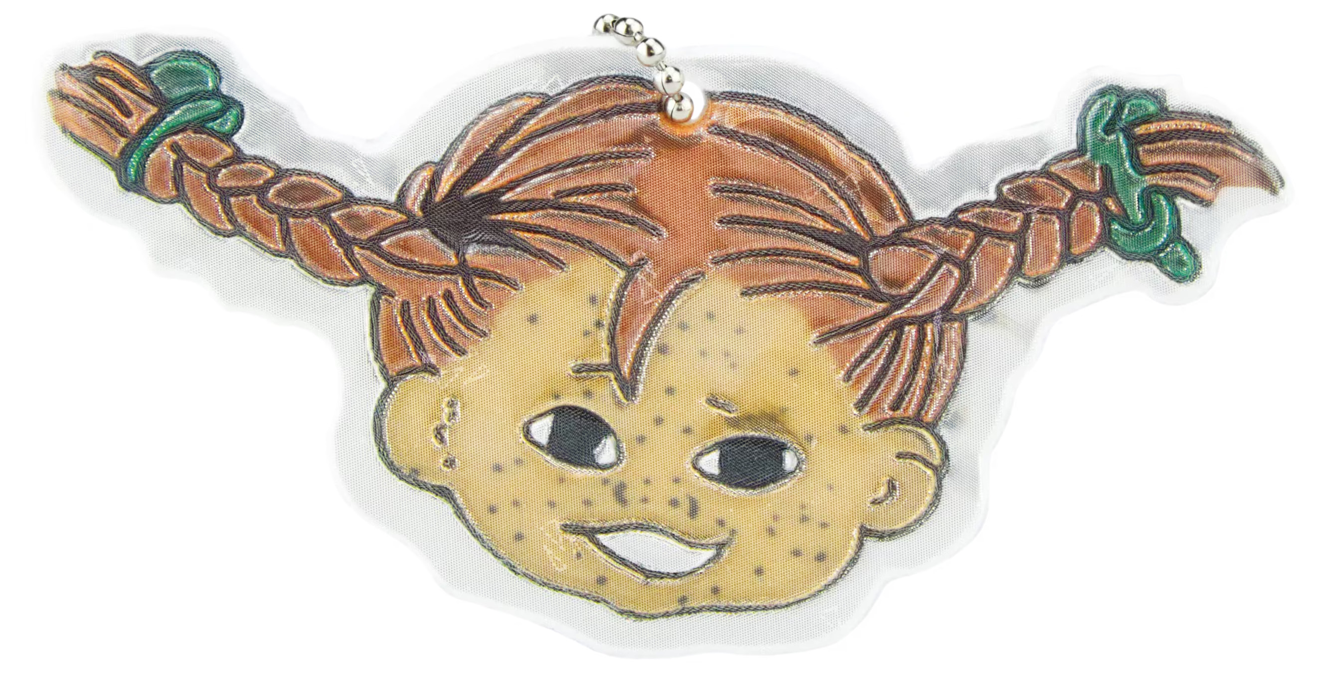 I bakgrunden av bilden syns inget specifikt utan fokus ligger helt på själva produkten. Den vita bakgrunden framhäver de färgglada detaljerna på reflexen och gör att alla element syns tydligt. Materialet runt Pippis ansikte är transparent, och den reflekterande ytan har en mikroskopisk textur som bidrar till dess effektivitet i mörka miljöer.