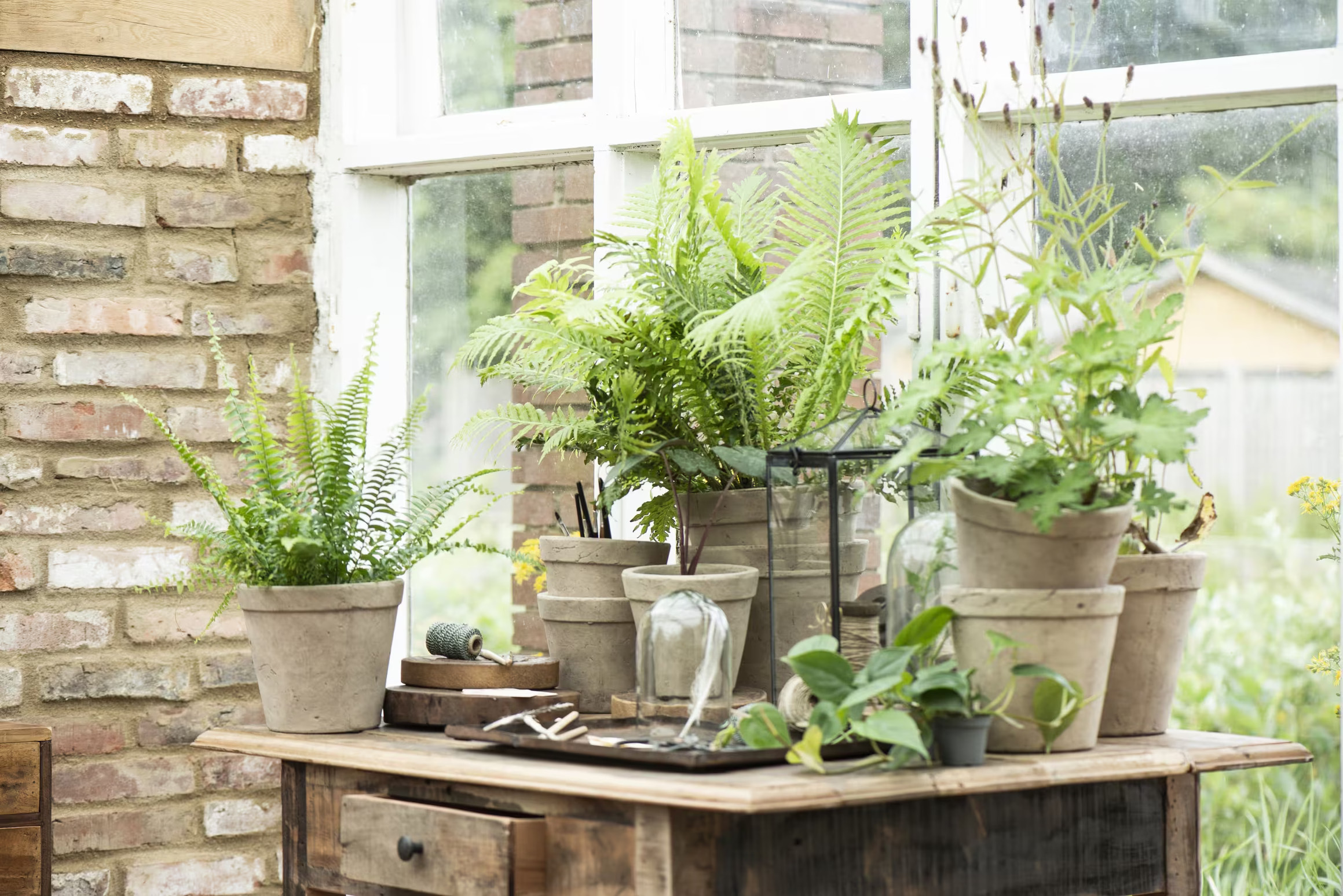 Bakom bordet syns en vacker, rustik tegelvägg som ger en varm och inbjudande bakgrund. Väggens tydliga struktur, med sina variationsrika tegelstenar i olika nyanser av rött och beige, kompletterar den naturliga och avslappnade känslan i detta inomhusväxthus. Ovanför bordet ser man stora fönster, som släpper in massor av naturligt ljus och skapar en ljus och luftig atmosfär. Genom fönstren kan man ana en grönskande trädgård där en mängd olika växter och blommor frodas.