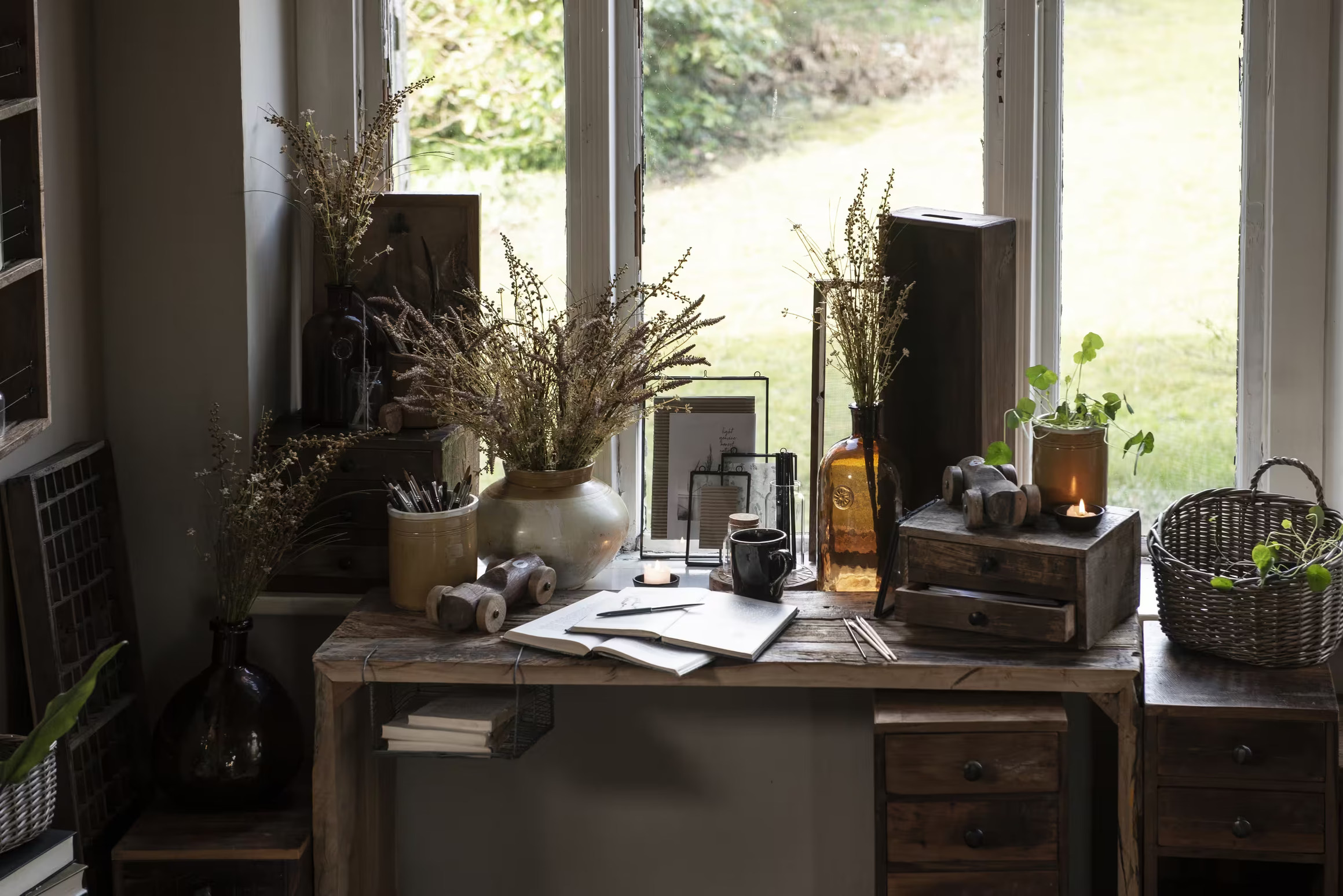 Intill byrån ser man en hög glasflaska i en djupt bärnstenfärg som reflekterar ljuset på ett mjukt sätt. En korg med växter och en mindre metallkorg fylld med block och anteckningsböcker fyller ut omgivningen och förstärker den lantliga känslan. Kombinationen av dessa element skapar en harmonisk atmosfär som passar både i en arbetsmiljö och i en personlig läshörna.
