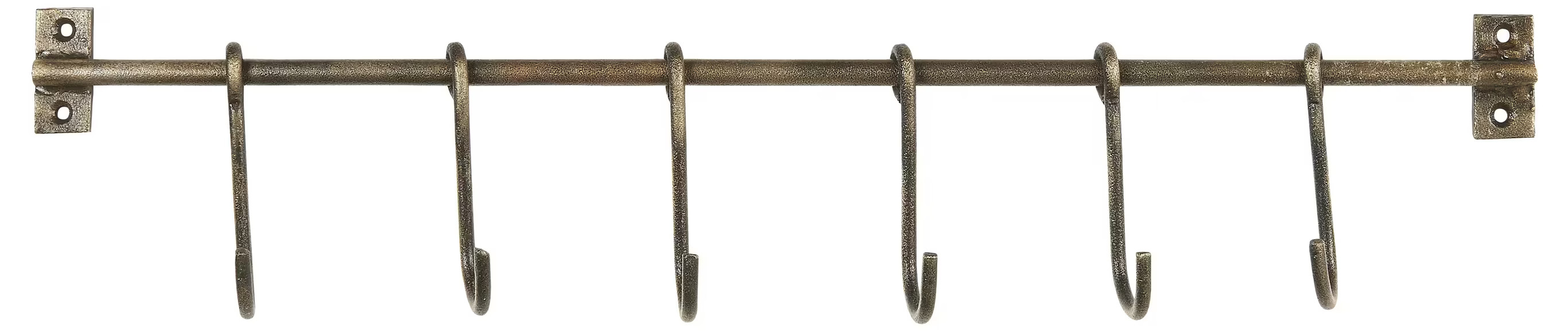 Väggskena Med Krokar är tillverkad i mässing, ett metalliskt material känt för sin hållbarhet och slitstarka egenskaper. Mässingen ger produkten en klassisk och tidlös känsla, samtidigt som den har ett funktionellt och praktiskt användningsområde. Ytan på väggskenan har en lätt patina, vilket ger en subtil vintage-look och en känsla av robusthet och kvalitet.