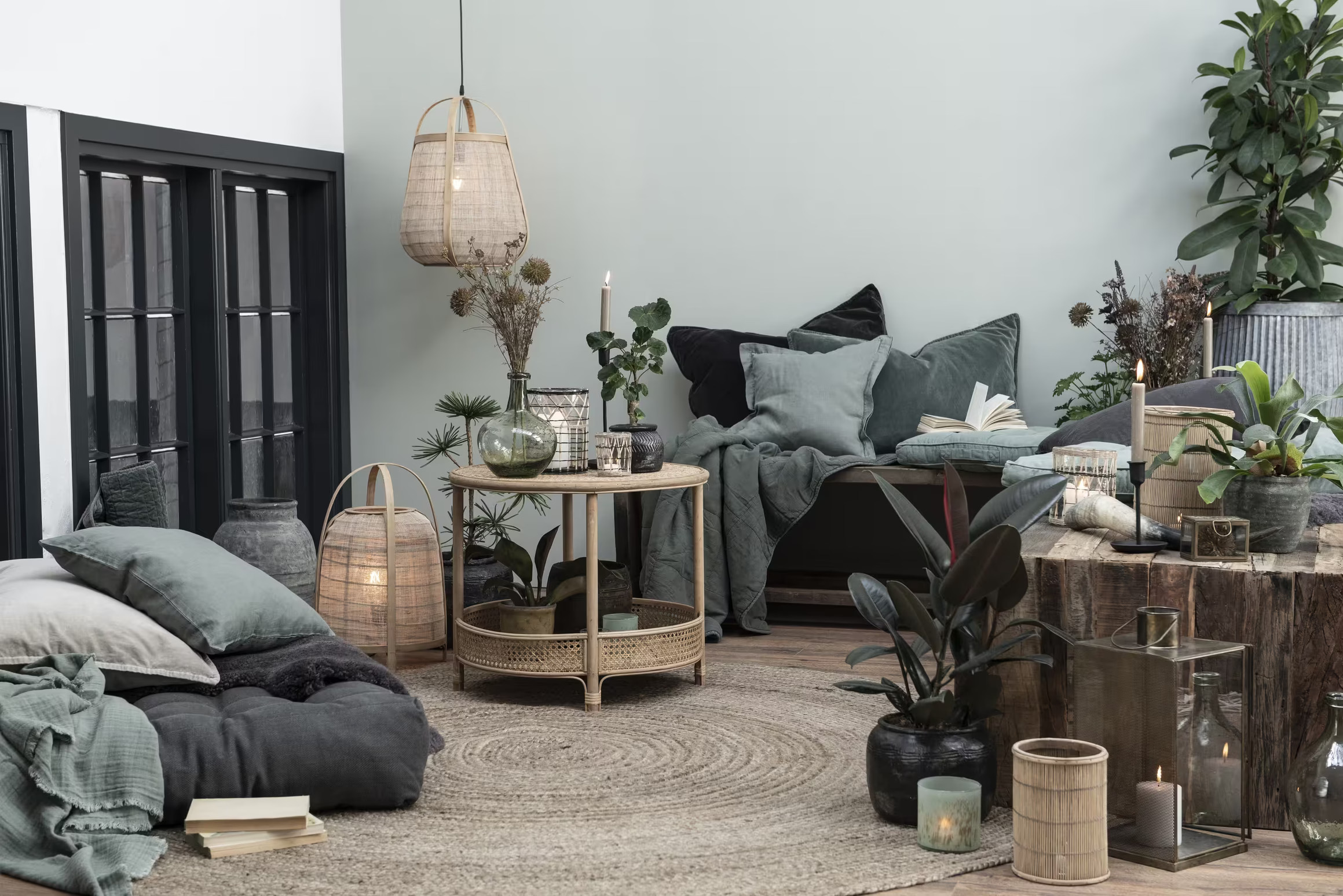 Runtomkring bordet och lampan finns flera andra inredningsdetaljer som tillsammans bygger upp en harmonisk och sammanhängande miljö. På golvet syns en rund matta av naturfärgat jute, som förstärker den jordnära atmosfären. Gröna växter och krukor står strategiskt placerade, och ger liv och färg åt rummet. Bredvid bordet till höger finns en liten soffa med en rad bekväma kuddar och en mjuk pläd, där det verkar pågå en mysig läshörna.