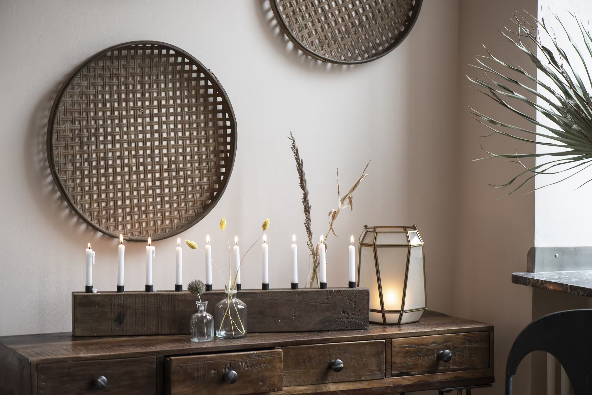 Bakom ljusstaken syns en ljus vägg, dekorerad med två stora, runda korgar i flätad design. Korgarna är gjorda av naturmaterial och har en luftig, genombruten struktur som tillför djup och textur till väggen utan att överta utrymmet. Deras placering och utformning harmonierar med den övergripande rustika och naturliga estetiken i rummet.