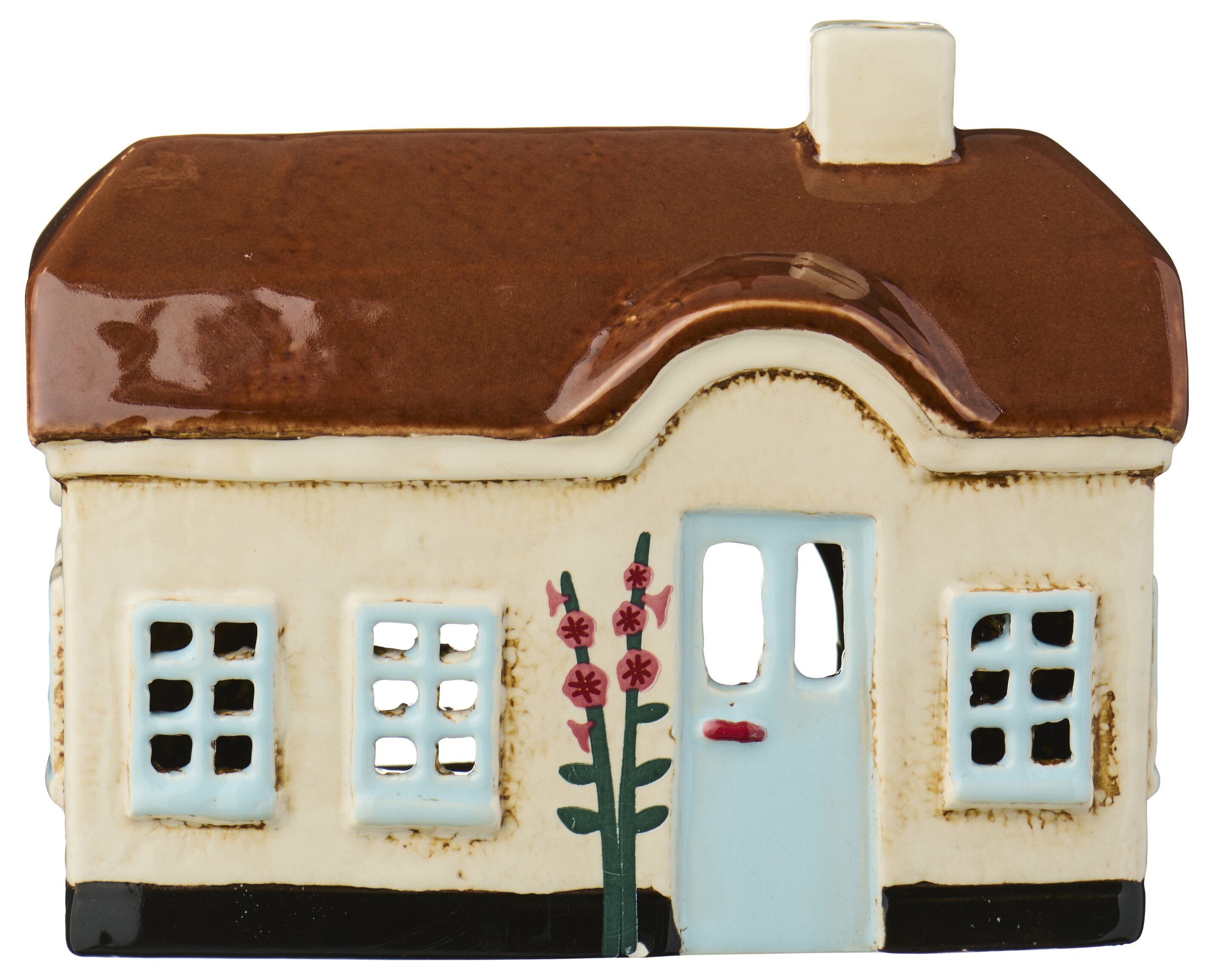 En charmig ljuslykta i form av ett litet hus, i mjuka cremefärgade toner med brunt tak och ljusblå dörrar och fönster. De handmålade blommorna ger en personlig och hemtrevlig känsla som gör lyktan extra levande.
