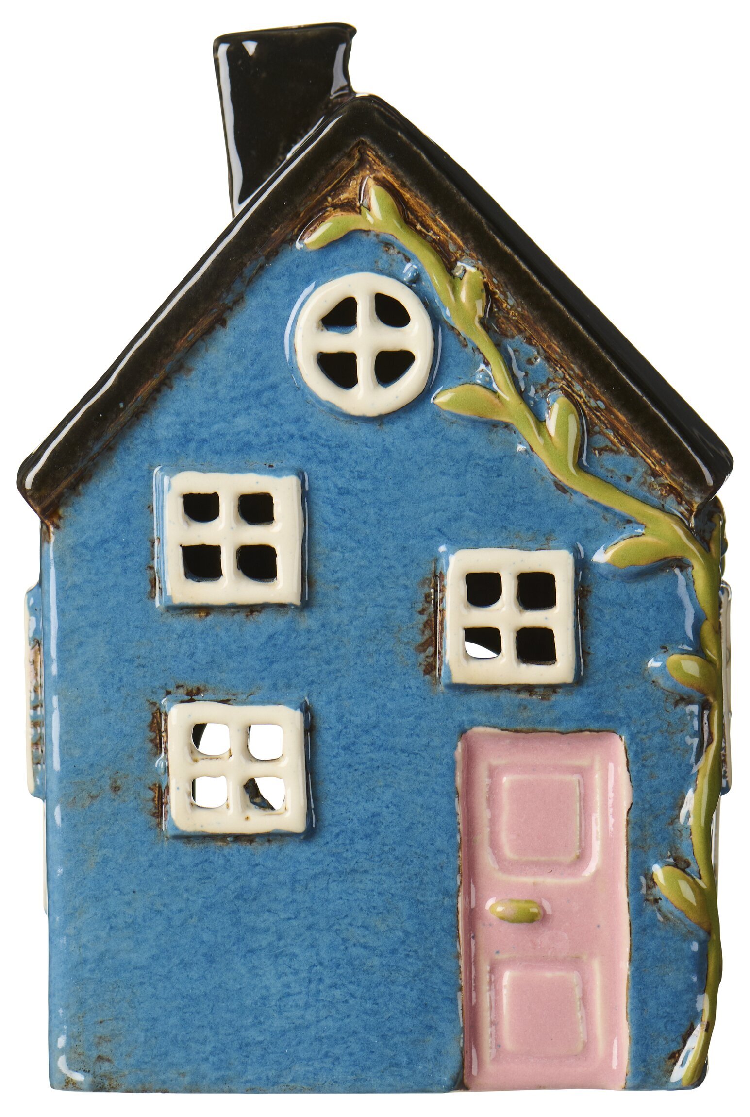 En lekfull och charmig ljuslykta i form av ett litet blått hus, med rosa dörr, vita fönster och fina detaljer som klättrande gröna blad längs fasaden. Den glansiga keramiken och de mjuka färgerna ger lyktan ett personligt och glatt uttryck.