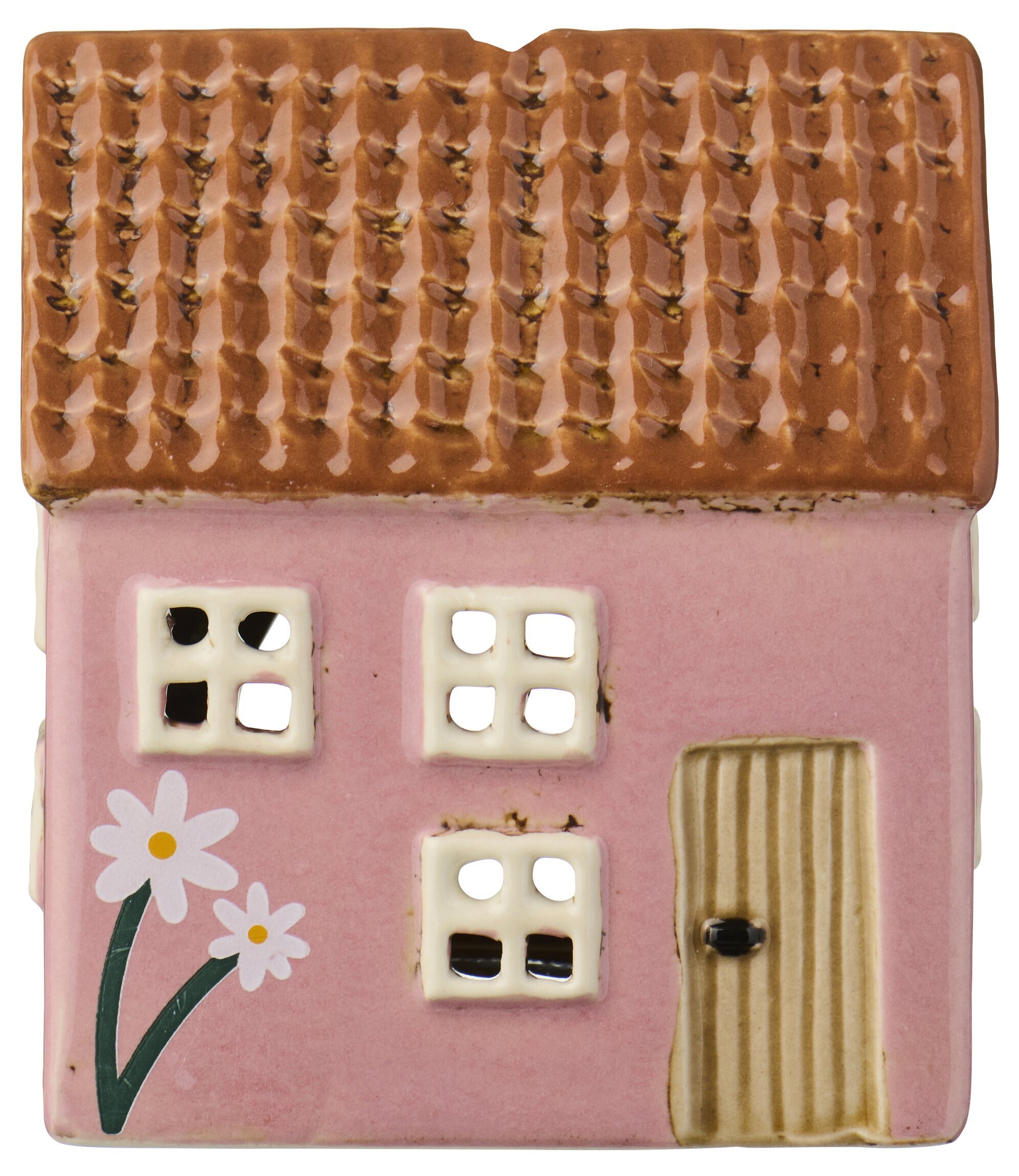 Rosa ljuslykta i form av ett litet hus är en charmig inredningsdetalj som skapar en varm och mysig känsla i hemmet. Med sin mjuka rosa fasad, fina fönster och det rustika taket blir lyktan ett sött blickfång som passar perfekt i både kök eller vardagsrum.