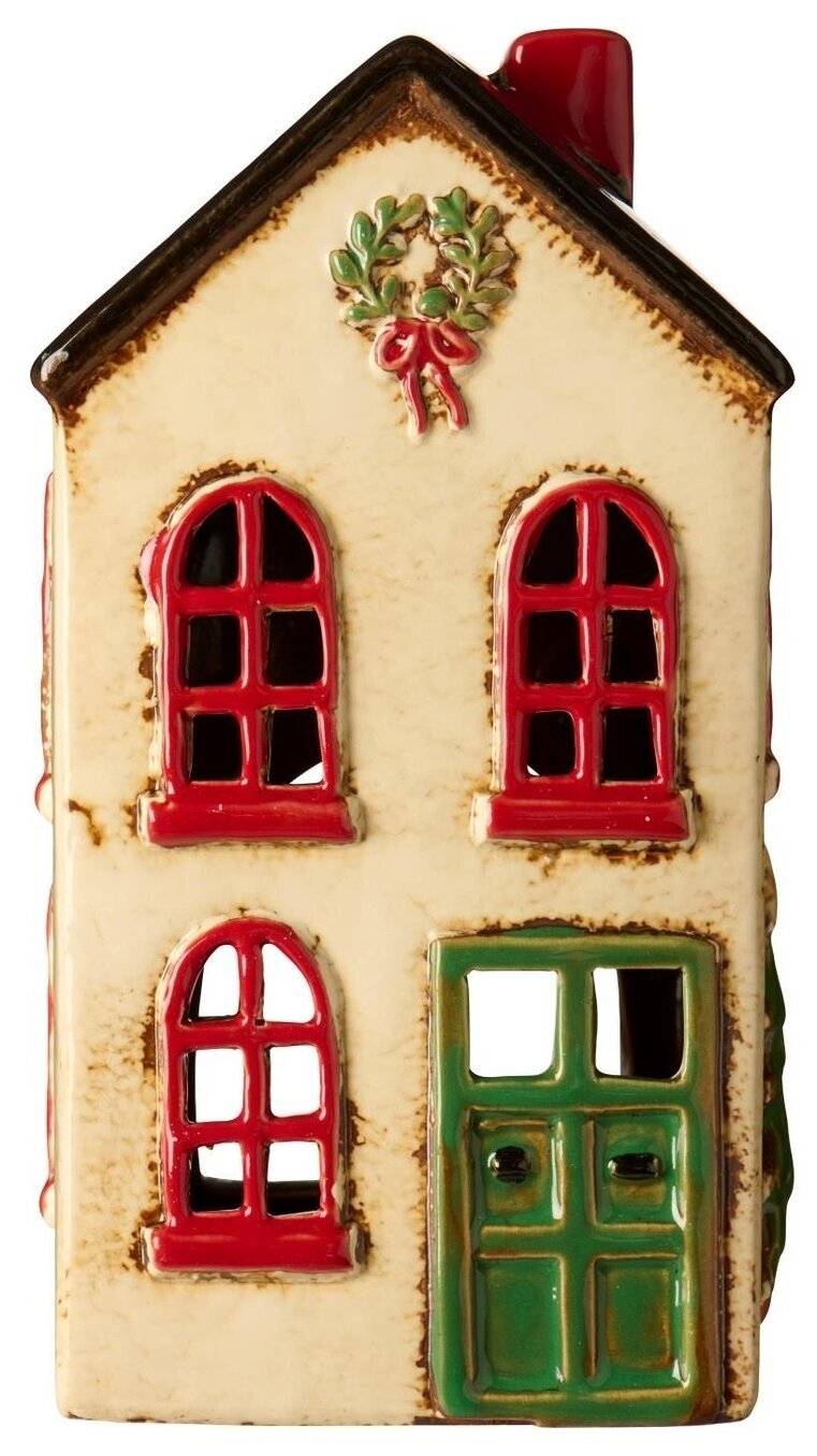 Detta charmiga hus i ljusa toner, med gröna dörrar och röda bågfönster, är en tidlös juldekoration. Den lilla kransen ovanför dörren ger en välkomnande känsla, och när ljuset sprider sig genom fönstren förvandlas huset till en strålande vinteridyll. En perfekt lykta att kombinera med de andra julhusen för att skapa en hel liten by full av stämning och värme.