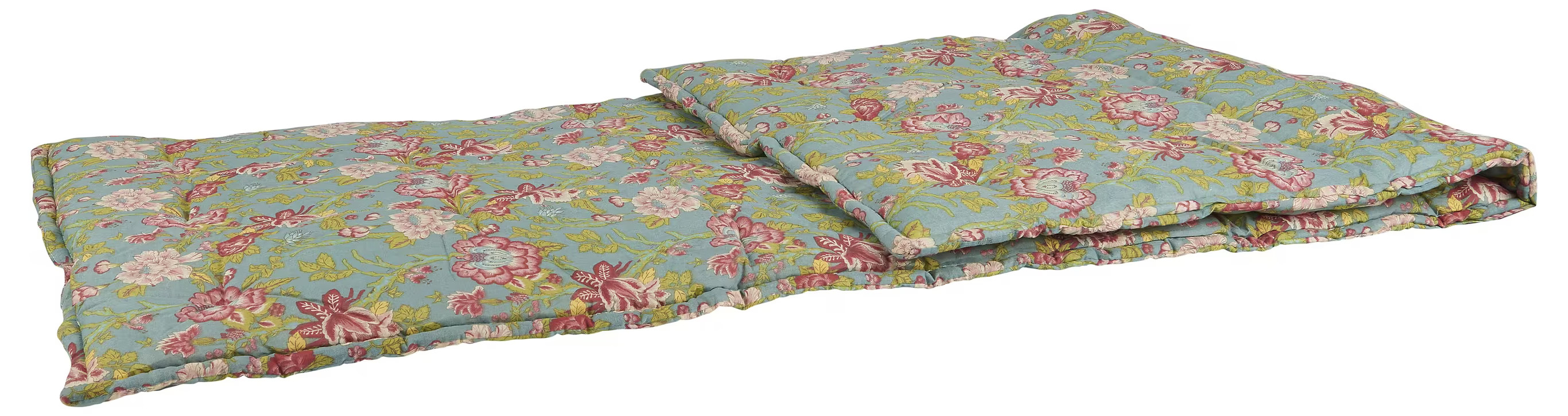 Denna madrass kännetecknas av ett färgstarkt och livligt blommönster på ett petrolfärgat tyg. Blomdesignen består av en mångfald av blommor i rosa, rött och vitt, med inslag av bladverk i grönt och gult. Detta ger madrassen en frodig och levande estetik som lätt kan förvandla vilket utrymme som helst. Det specifika valet av petrolfärg ger en lugn och samtidigt framträdande bakgrund som bidrar till att blomsterdesignen verkligen kommer till sin rätt.