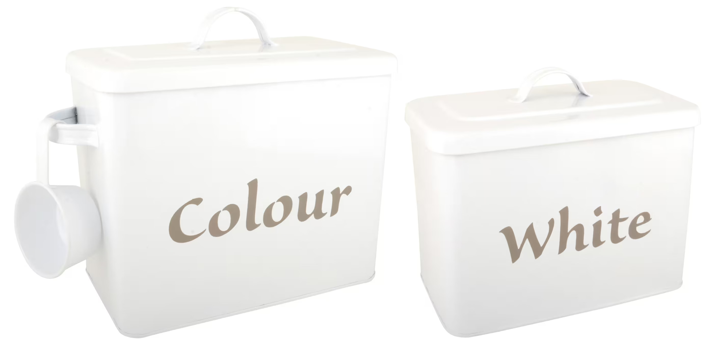 Den första burken, märkt med ordet "Colour", är något större och har en unik funktion med ett medföljande doseringsmått, som praktiskt hänger på sidan av burken. Doseringsmåttet matchar burkens vita färg och är lättillgängligt för att mäta upp rätt mängd tvättmedel för din färgtvätt. Lockets handtag är stadigt och gott att greppa, vilket gör det enkelt att öppna och stänga burken.