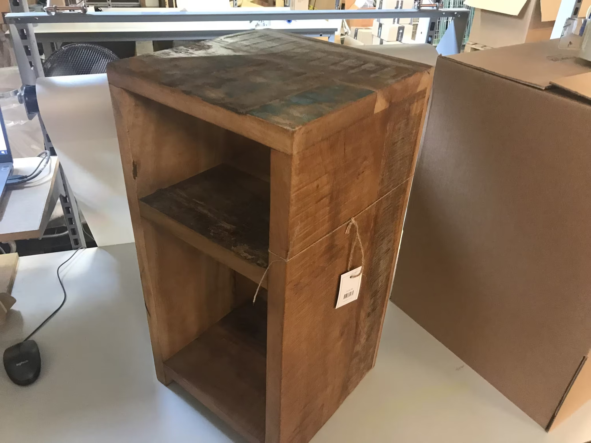 Omgivningen runt Sidobord Unika verkar vara en lager- eller arbetsyta med diverse andra objekt som syns i närheten. Bakom bordet finns kartonger och annan förvaringsutrustning, vilket ger en antydan om att detta kan vara en plats där möbler tillverkas eller lagras.