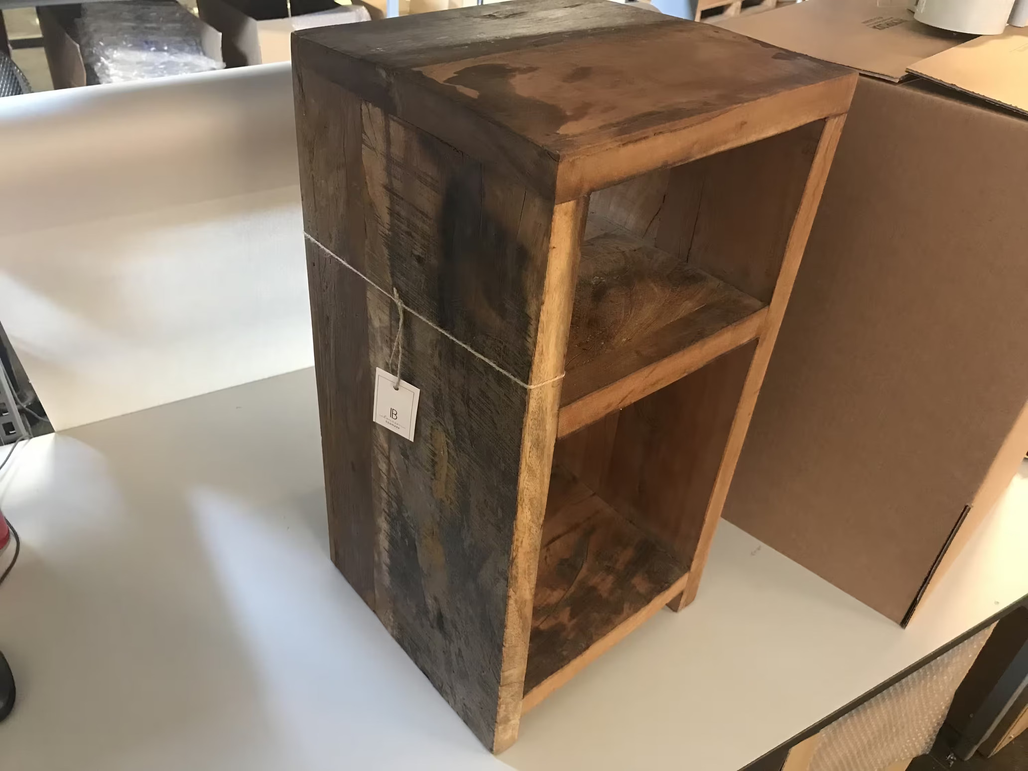 Omgivningen på bilden visar att sidobord Unika befinner sig i en lager- eller butiksinställning, med kartonger och förpackningsmaterial synliga i bakgrunden. Bordet står på en vit yta, vilket framhäver dess naturliga trätoner och de unika detaljerna i materialet. Denna miljö ger en inblick i hur produkten lagras före leverans till kund, och framhäver samtidigt den omsorg och tanke som lagts ned på presentationen av produkten.