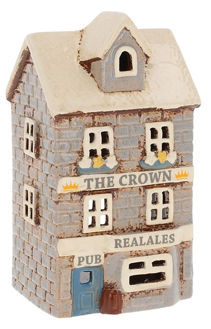 Dekorativ ljuslykta i keramik formad som en liten brittisk pub med grå stenfasad, klassiska fönster och detaljerade skyltar med texten The Crown och Real Ales. Läs mer