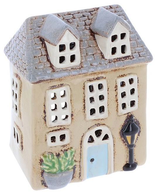 Ett charmigt stadshus i keramik med vackra detaljer som blå dörr, takkupor, blomkruka och en klassisk lyktstolpe vid entrén. Med ett värmeljus eller en ljusslinga inuti sprids ett varmt ljus genom fönstren – perfekt för att skapa mysig stämning i hemmets alla rum. En stilfull dekoration som passar året runt och gör sig lika fint ensam som i en liten husby.