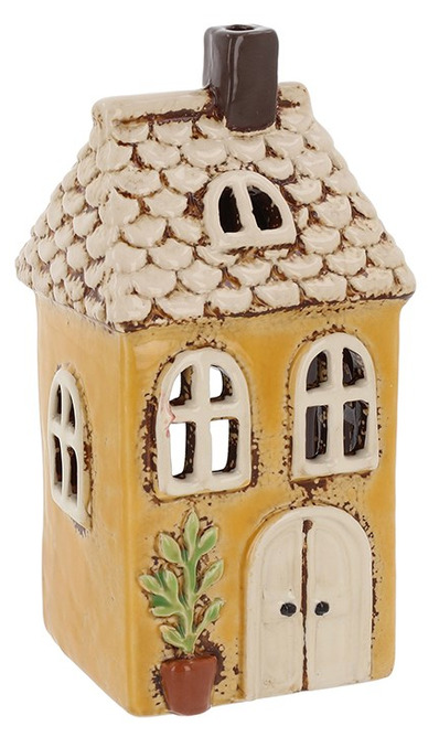 Dekorativ ljuslykta formad som ett litet hus, tillverkad i keramik med varm gul fasad och fint utformade detaljer. När du placerar ett värmeljus inuti sprids ett mjukt och stämningsfullt sken genom fönstren.