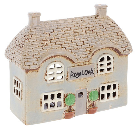 Skapa varm och hemtrevlig stämning med denna charmiga ljuslykta i form av det mysiga huset Royal Oak. Placera ett värmeljus inuti och se hur de små fönstren lyser upp rummet med ett mjukt, inbjudande sken.