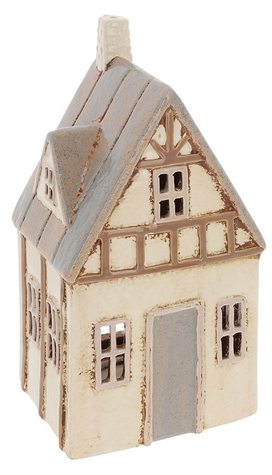 Detta charmiga lilla korsvirkeshus sprider en mysig och lantlig känsla när ljuset lyser genom de små fönstren. De rustika detaljerna och de mjuka tonerna gör ljuslyktan till en dekorativ inredningsdetalj som passar perfekt i både moderna och traditionella hem.