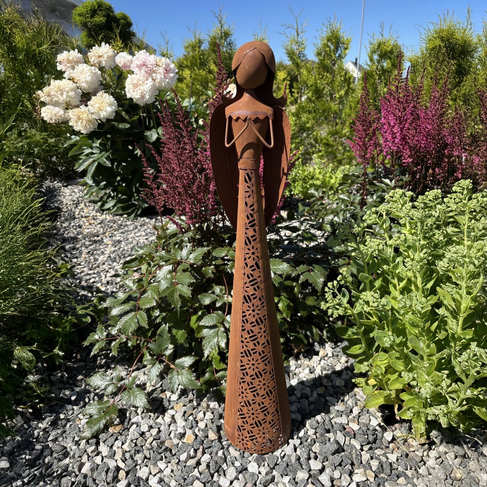 En underbar och ståtlig ängel i rostig metall som blir ett blickfång i trädgården eller vid entrén. Ängeln är ca 85 cm hög (inkl. pinnar) och har en diameter på 14 cm.