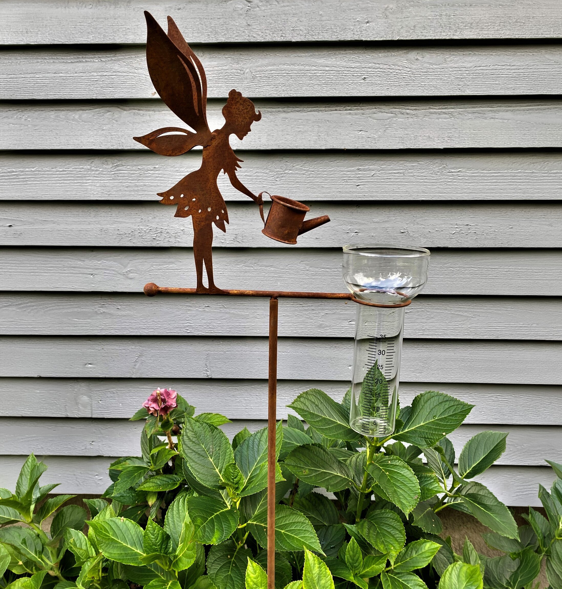 Dekorativ regnmätare i rostfinish samt mätarglas i glas, en fin detalj i trädgården.