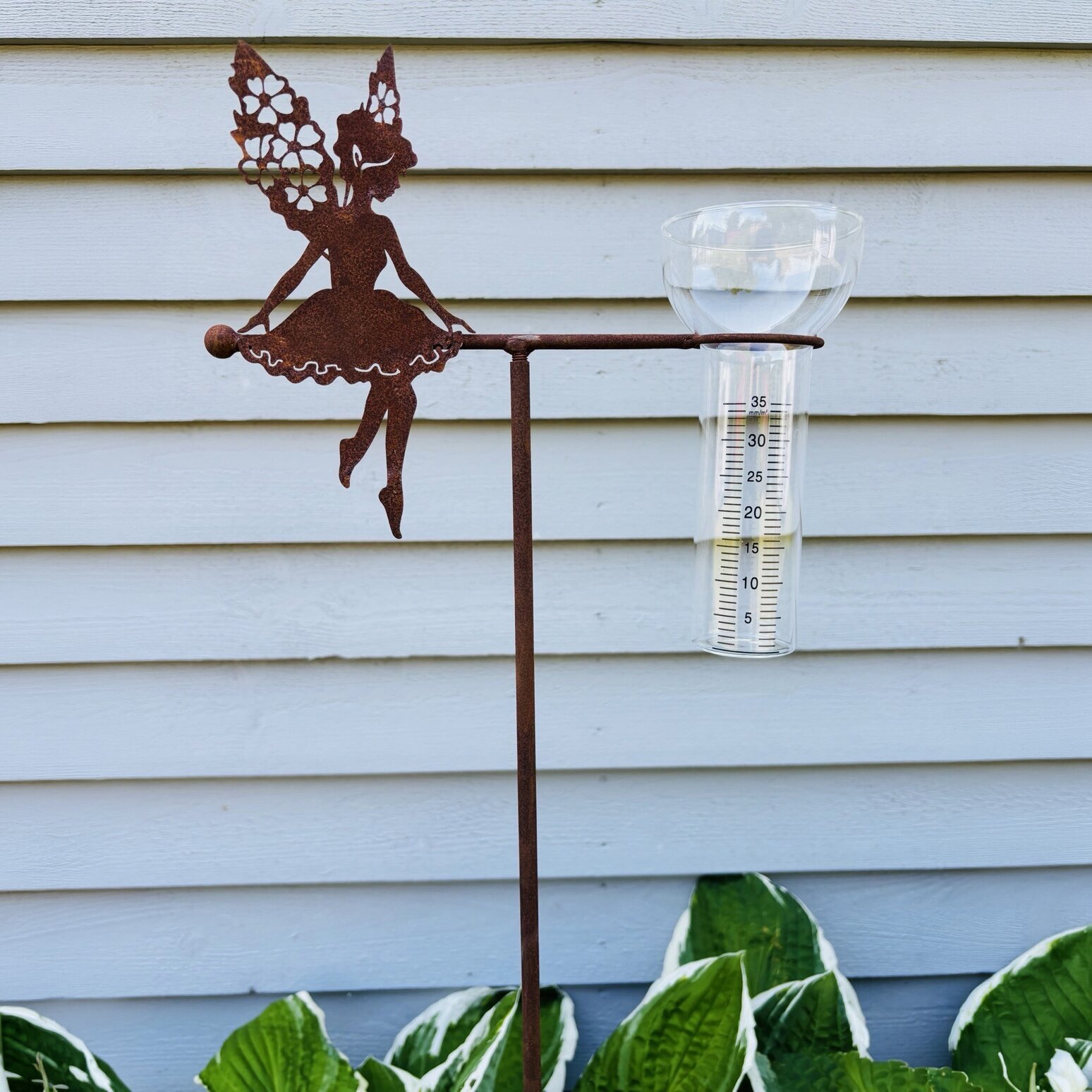 En underbar regnmätare med sittande älva och vackra, detaljrika vingar som blir en fin och stämningsfull dekoration i trädgården. Den rostiga finishen ger ett varmt och charmigt uttryck, och regnmätarglaset är tillverkat i riktigt glas. Regnmätaren är dessutom delbar i tre delar, vilket gör den smidig att hantera och placera.