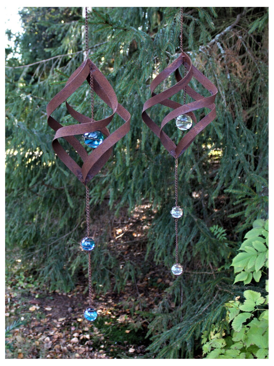 Ge trädgården eller balkongen ett lyft med denna vackra spiraldekoration i rostmetall. Den snurrar mjukt i vinden och fångar ljuset i den skimrande glaskulan. Finns i två färger – välj den som passar bäst i din miljö eller kombinera båda för en ännu mer levande känsla. En charmig detalj som sprider både glädje och elegans året runt.
