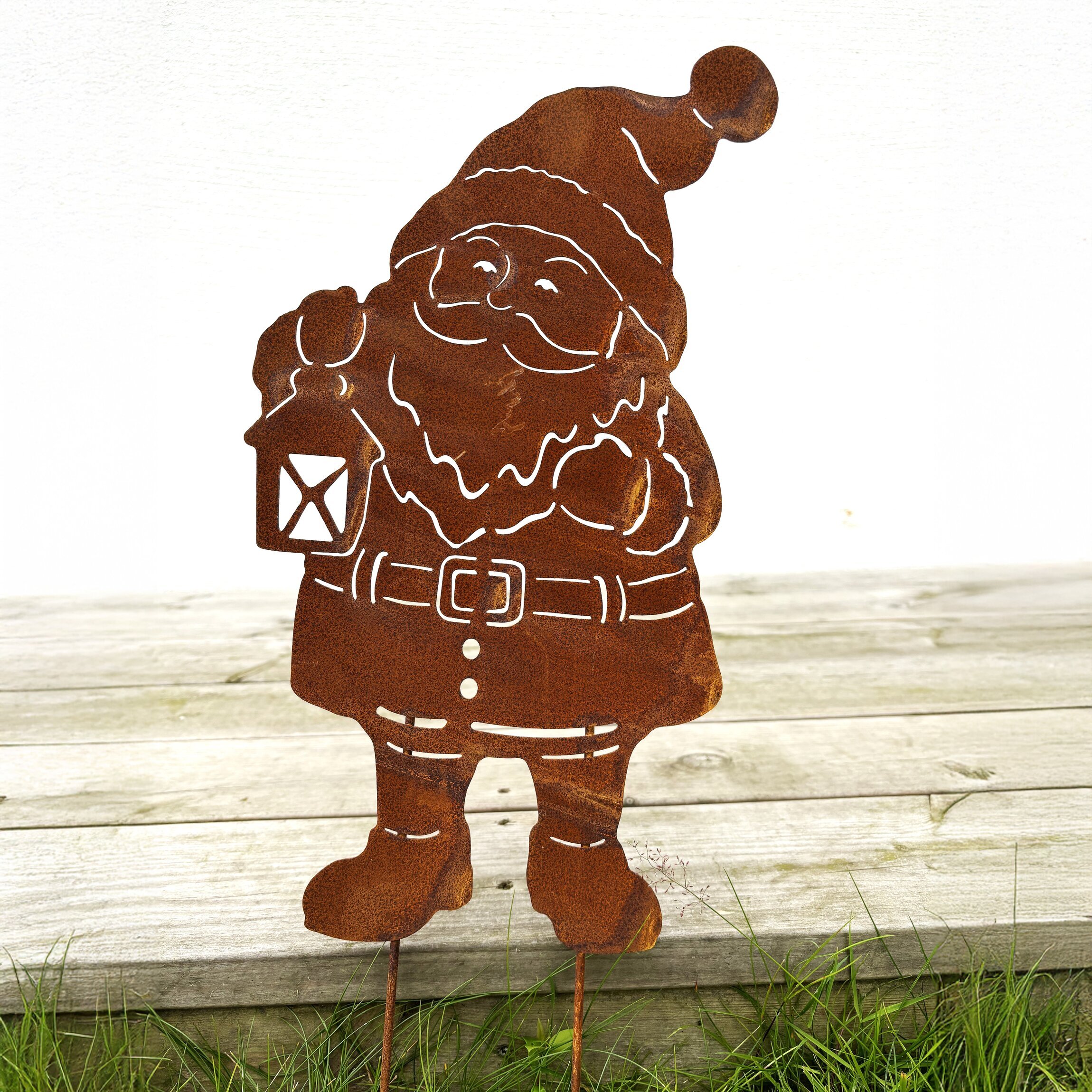 Skapa härlig julstämning utomhus med denna dekorativa tomte i rostig metall. Tomten håller en lykta och sprider både charm och värme i trädgården, vid entrén eller på altanen.