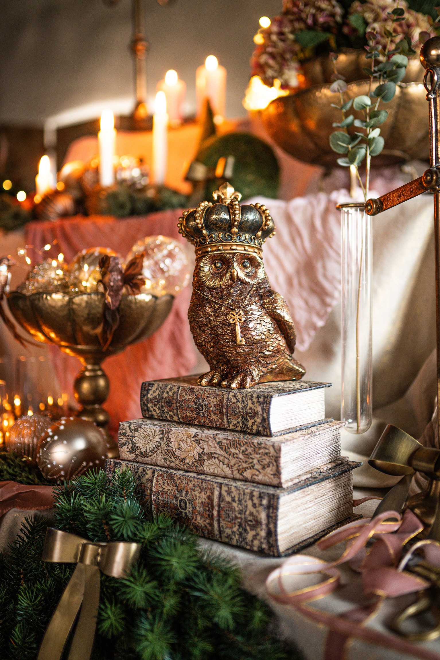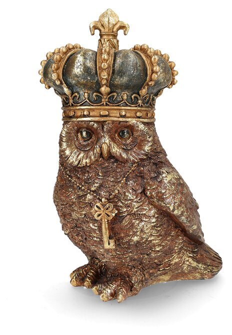 En fantasifull och elegant dekorationsfigur i form av en uggla med kunglig krona. Med sina detaljer i guld och brons blir den en rolig och originell inredningsdetalj som sprider både karaktär och lekfullhet.