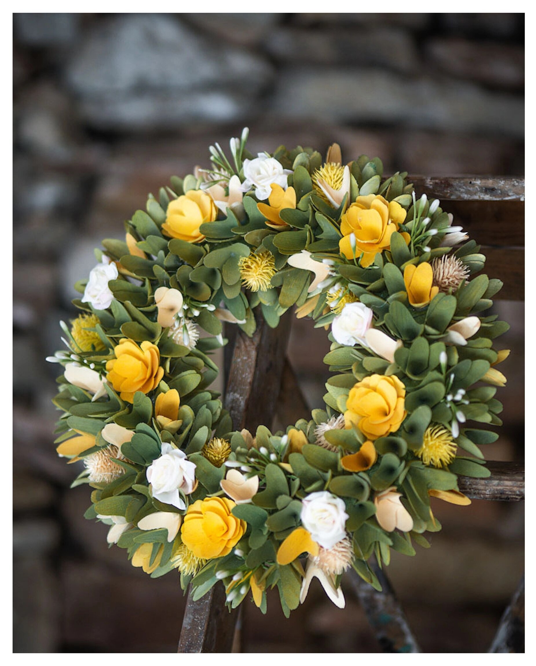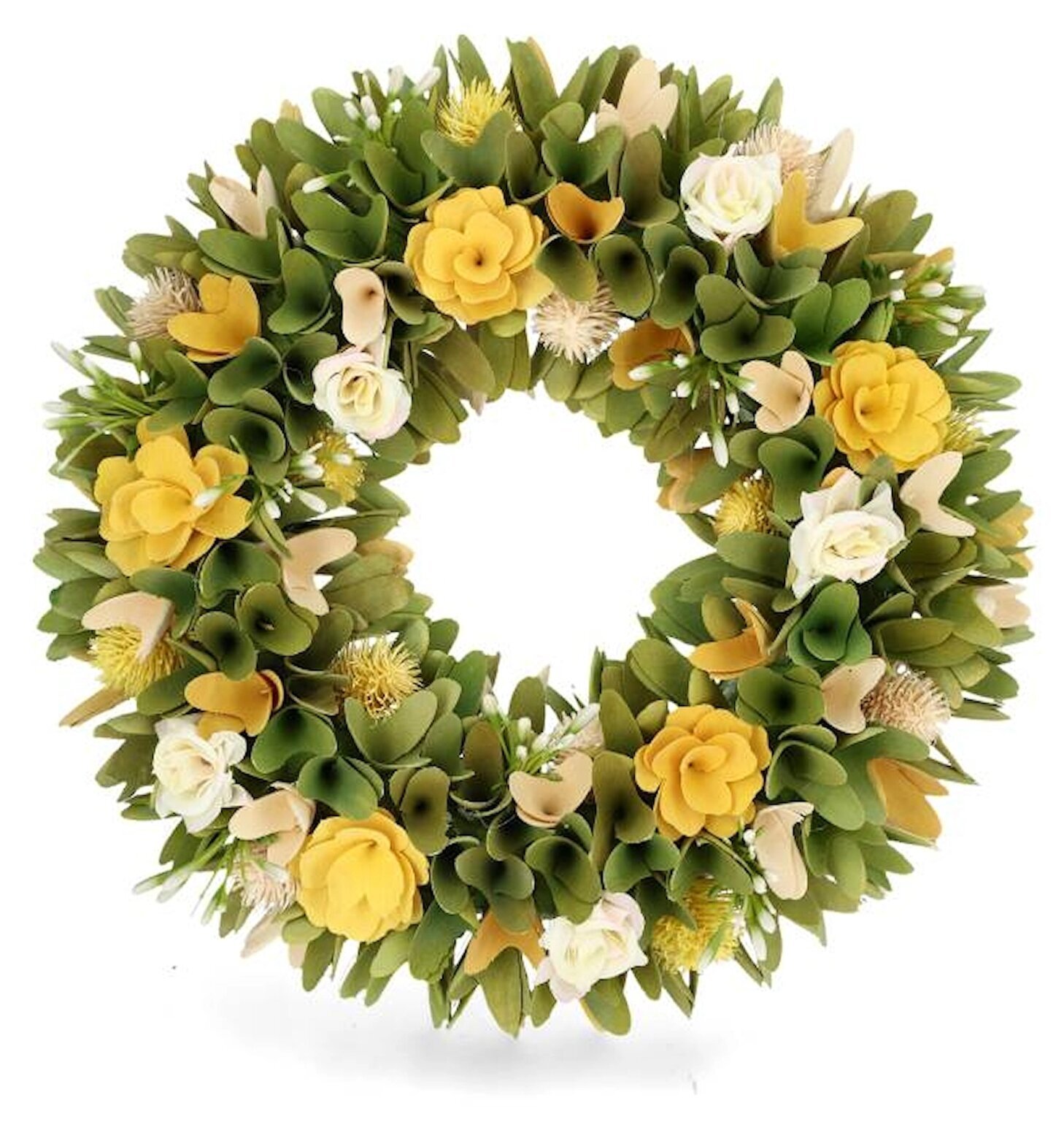 En vacker blomkrans som sprider vårkänsla året runt. Med mjuka gröna blad och dekorativa blommor i gult och vitt blir den en ljus och välkomnande detalj på dörren, väggen eller i fönstret.