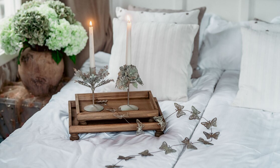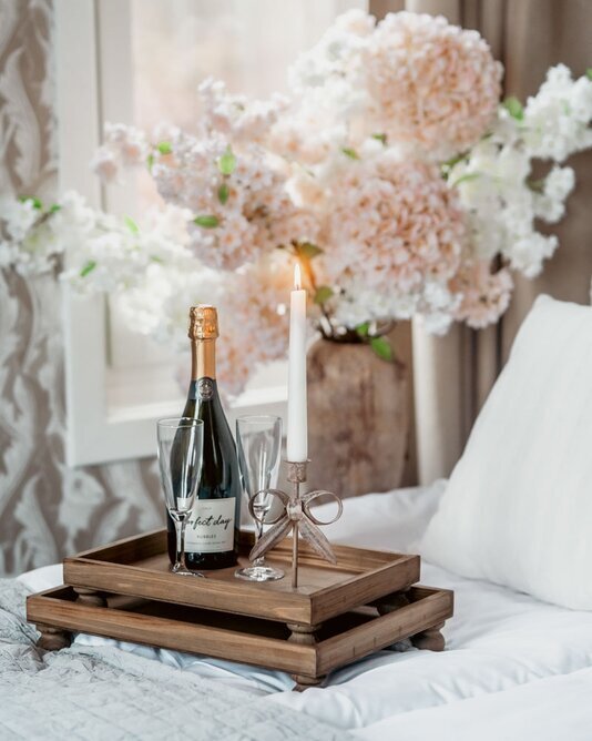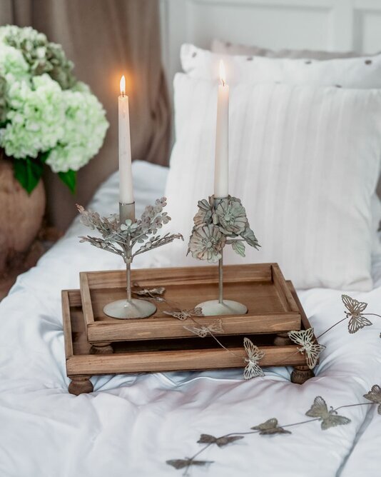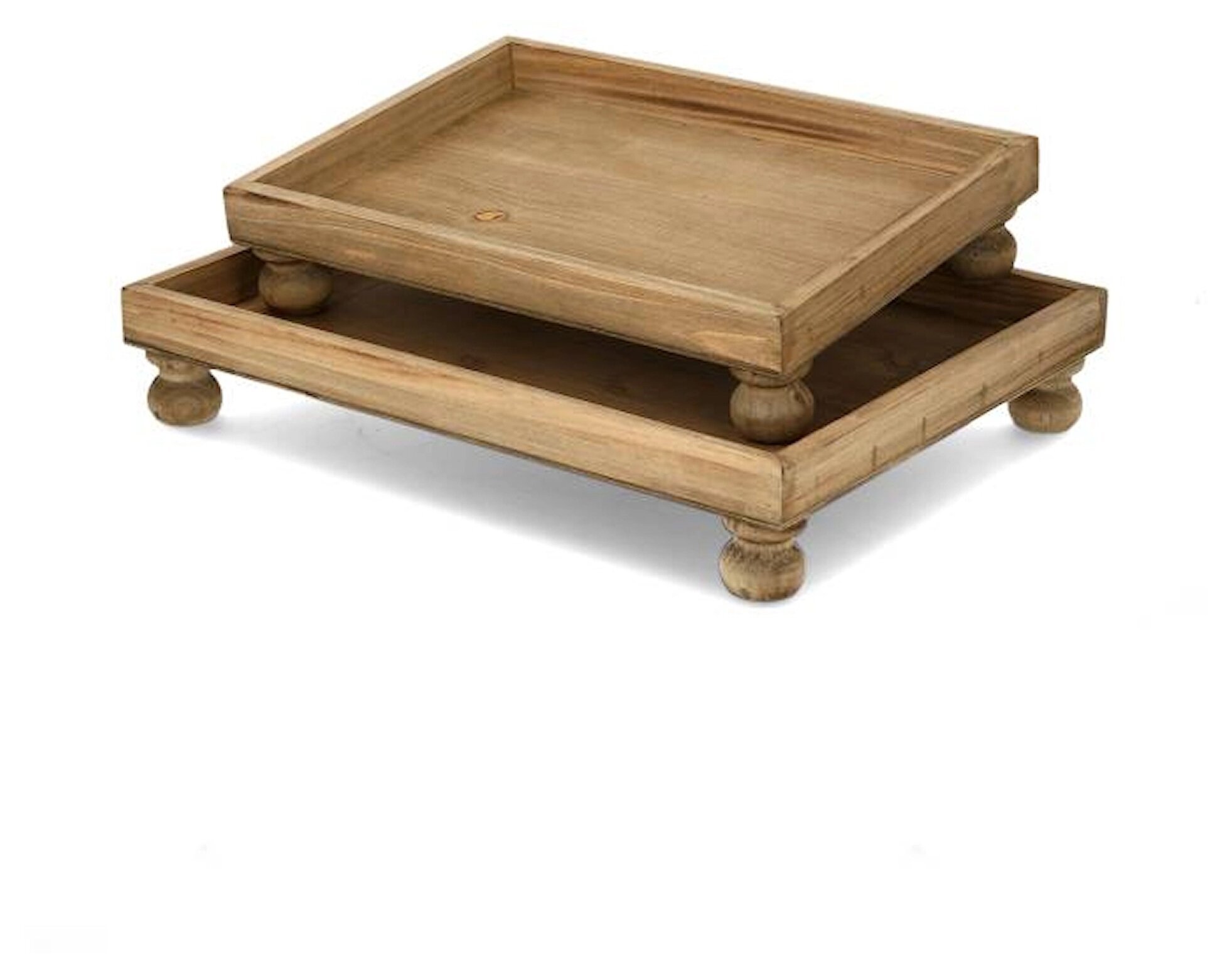 Ett vackert set med två rektangulära brickor i trä, designade med dekorativa fötter som ger en elegant och luftig känsla. Den varma trätonen och den klassiska formen gör dem till en stilren detalj i både sovrum, vardagsrum och kök.