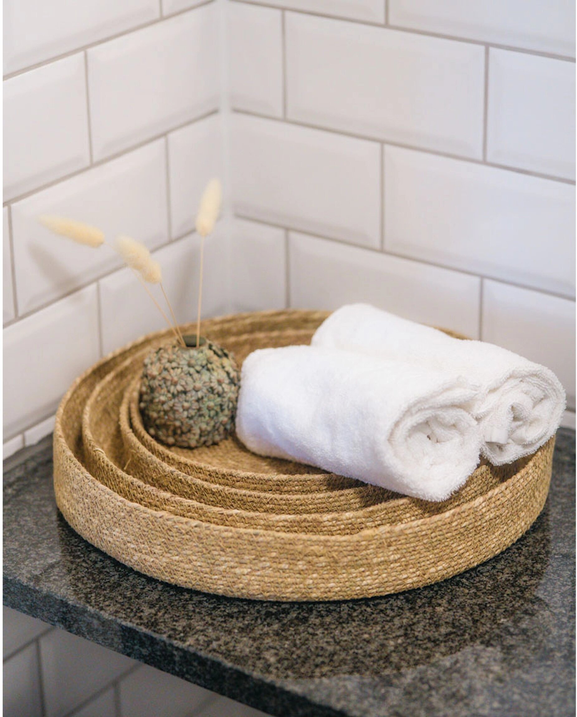 Ett dekorativt set med fyra brickor i naturmaterial. De flätade brickorna har en varm och naturlig ton som ger en mjuk och inbjudande känsla i hemmet. Läs mer