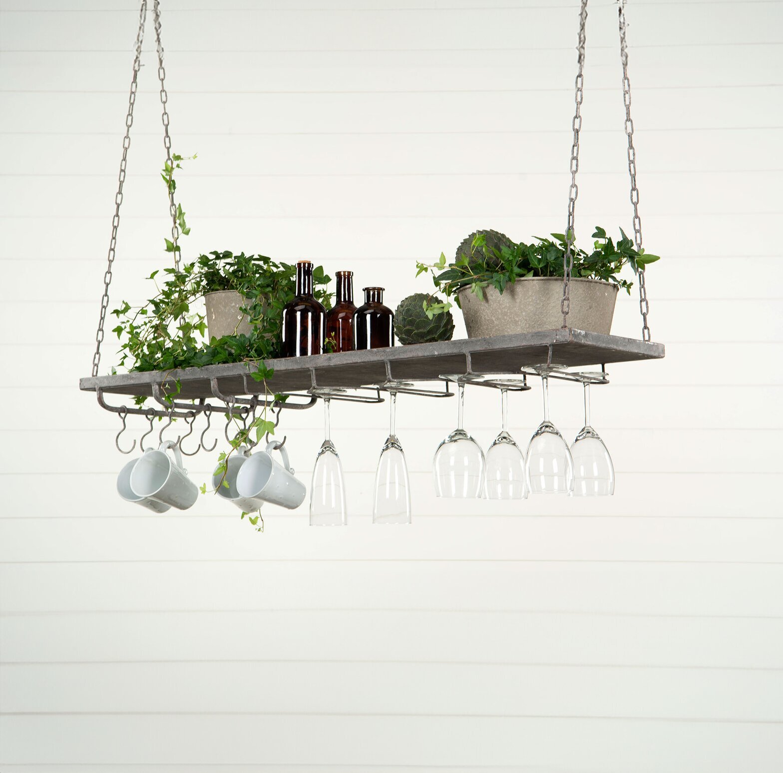 Hängande metallhylla som både är funktionell och dekorativ med sin rymliga design och praktiska krokar för glas, koppar eller andra föremål. Den rustika stilen och robusta kedjeupphängningen gör den till en charmig detalj i kök, matsal eller uterum. Använd den för att skapa en personlig och stilfull förvaringslösning eller för att visa upp växter, flaskor och andra dekorativa element. Perfekt för dig som vill kombinera praktisk förvaring med en unik inredningsdetalj.