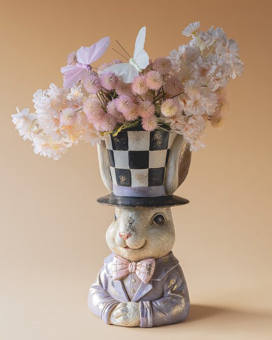En lekfull och dekorativ byst i form av en kanin med hög hatt. De fina detaljerna och de mjuka färgerna ger ett charmigt uttryck som passar perfekt till påsk och vår.