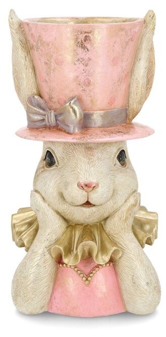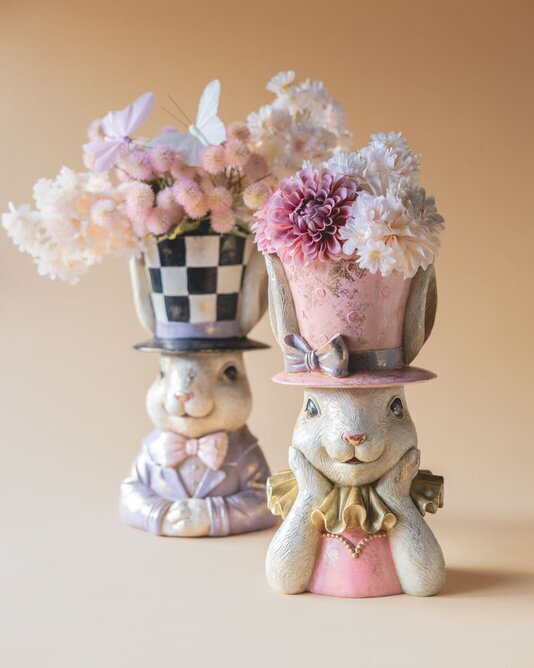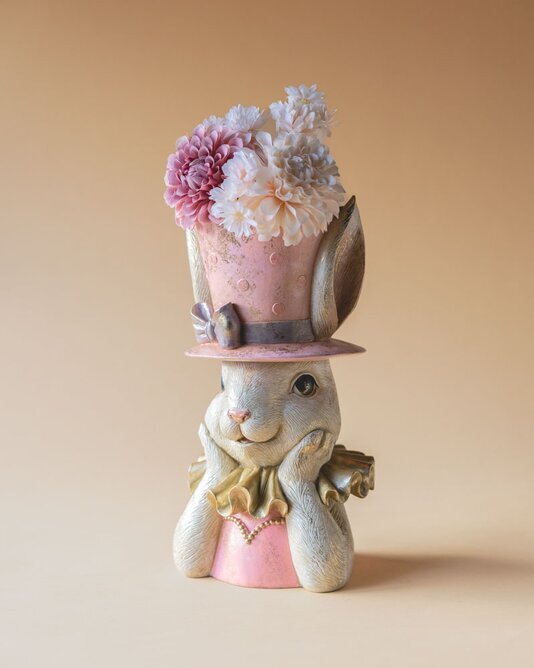 En charmig byst i form av en kanin med rosa hatt och fina detaljer. Det lekfulla uttrycket och de mjuka färgerna gör den till en härlig dekoration för påsk och vår.