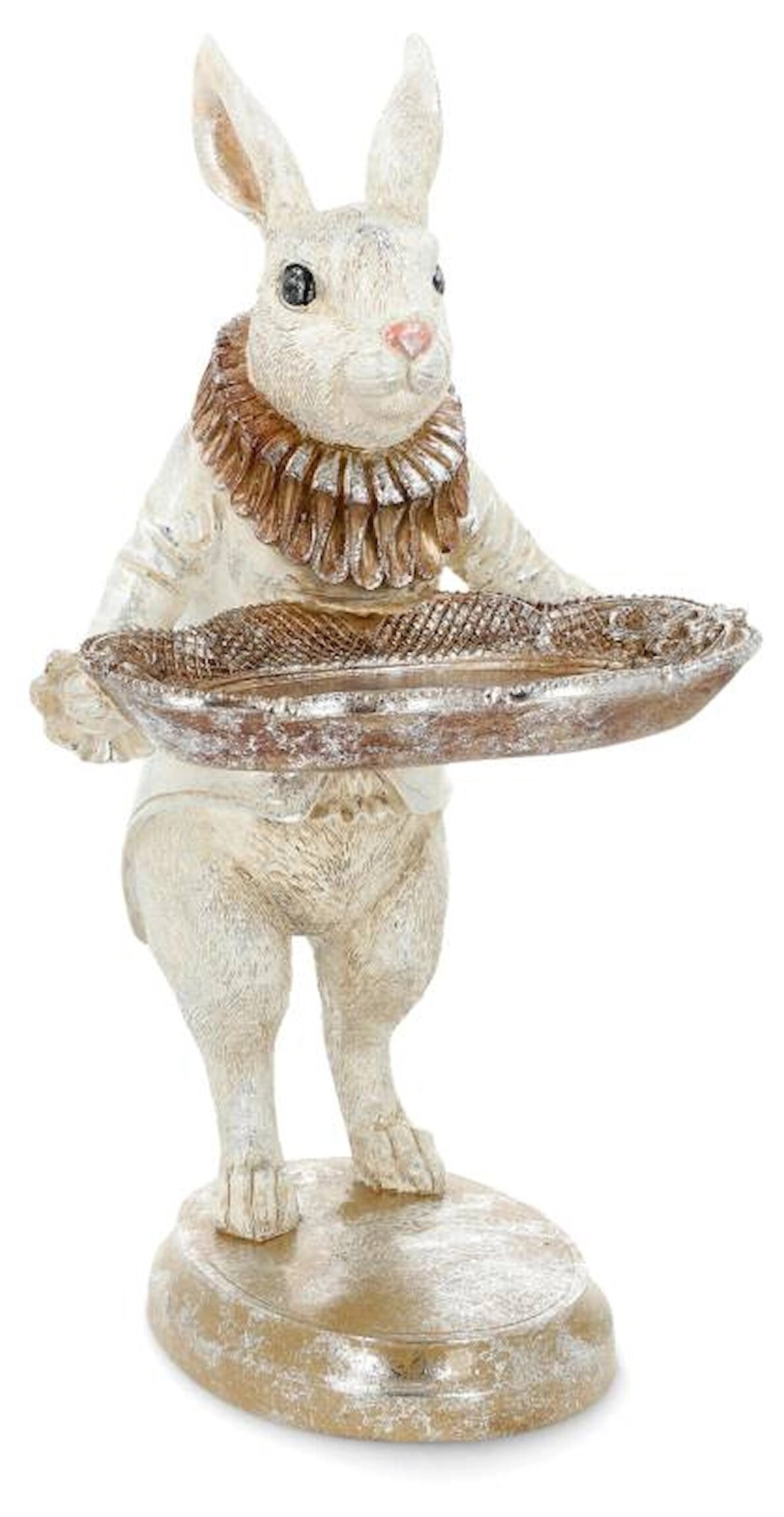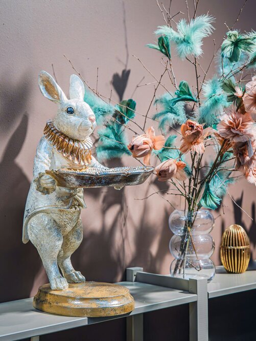 En charmig och dekorativ kaninfigur som garanterat drar blickarna till sig. Kaninen står stolt med ett fat i händerna och blir en unik inredningsdetalj med både humor och elegans.