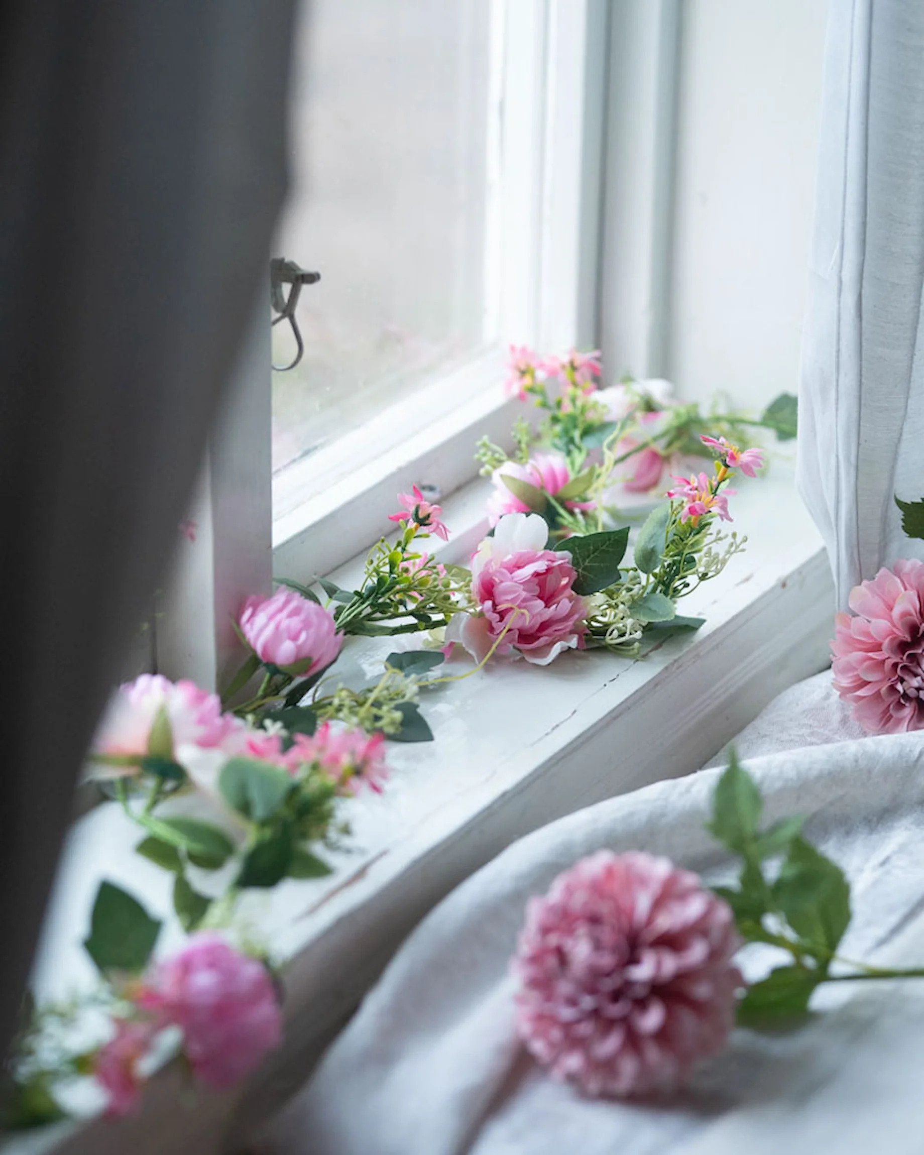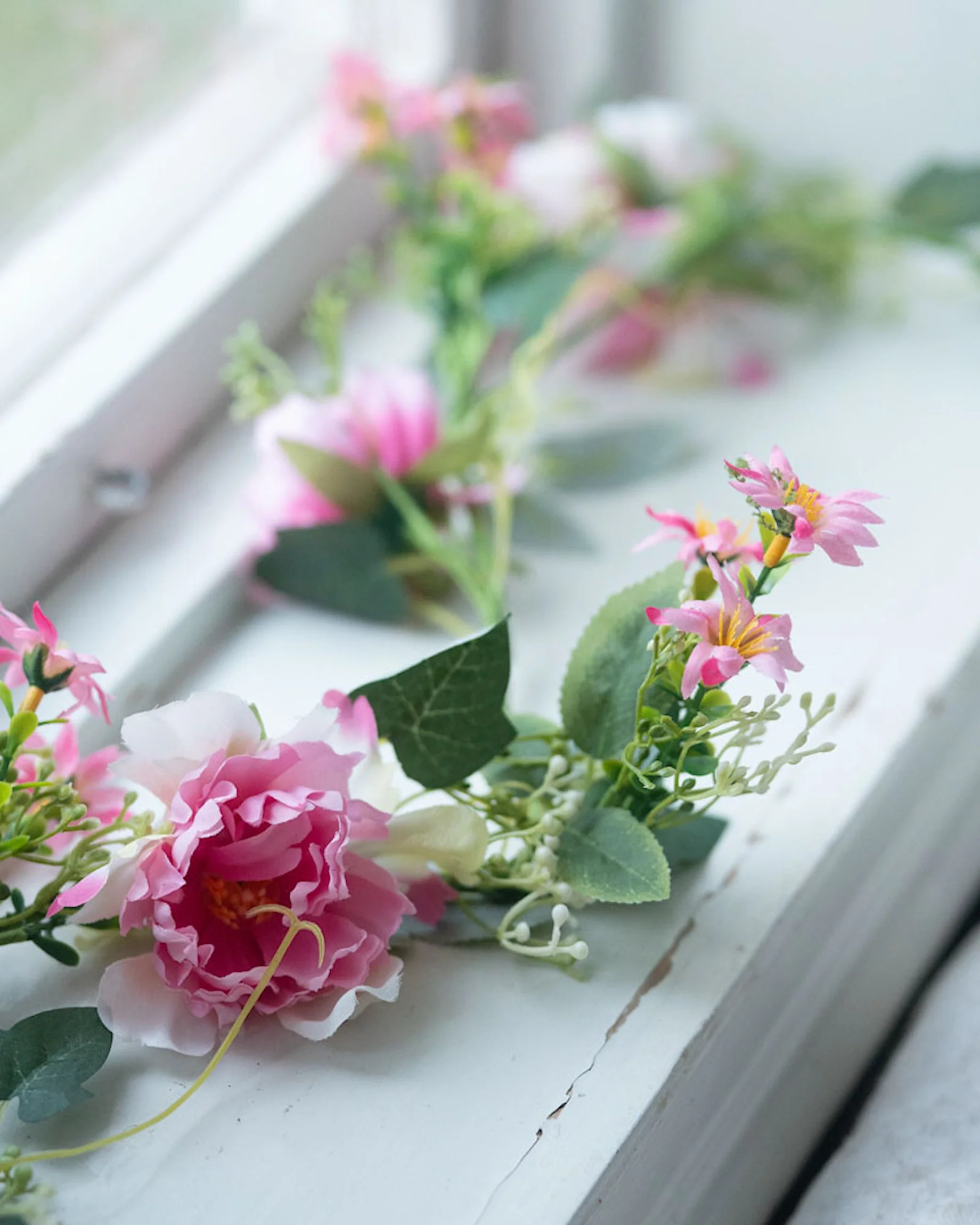 Ge tillvaron en mjuk och levande färgton med denna vackra blomgirlang – en stilfull dekoration som passar lika fint till bröllop och fest som till att skapa en inbjudande atmosfär i hemmet.