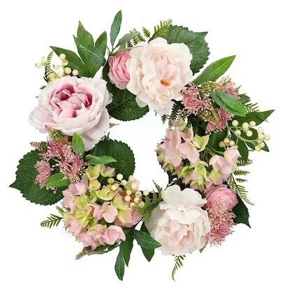 En mjuk och romantisk blomsterkrans som skapar stämning året om. De fylliga pionerna och de skira hortensiorna ger ett naturligt och harmoniskt uttryck, vackert balanserat med gröna blad och små detaljer som ger liv och djup.