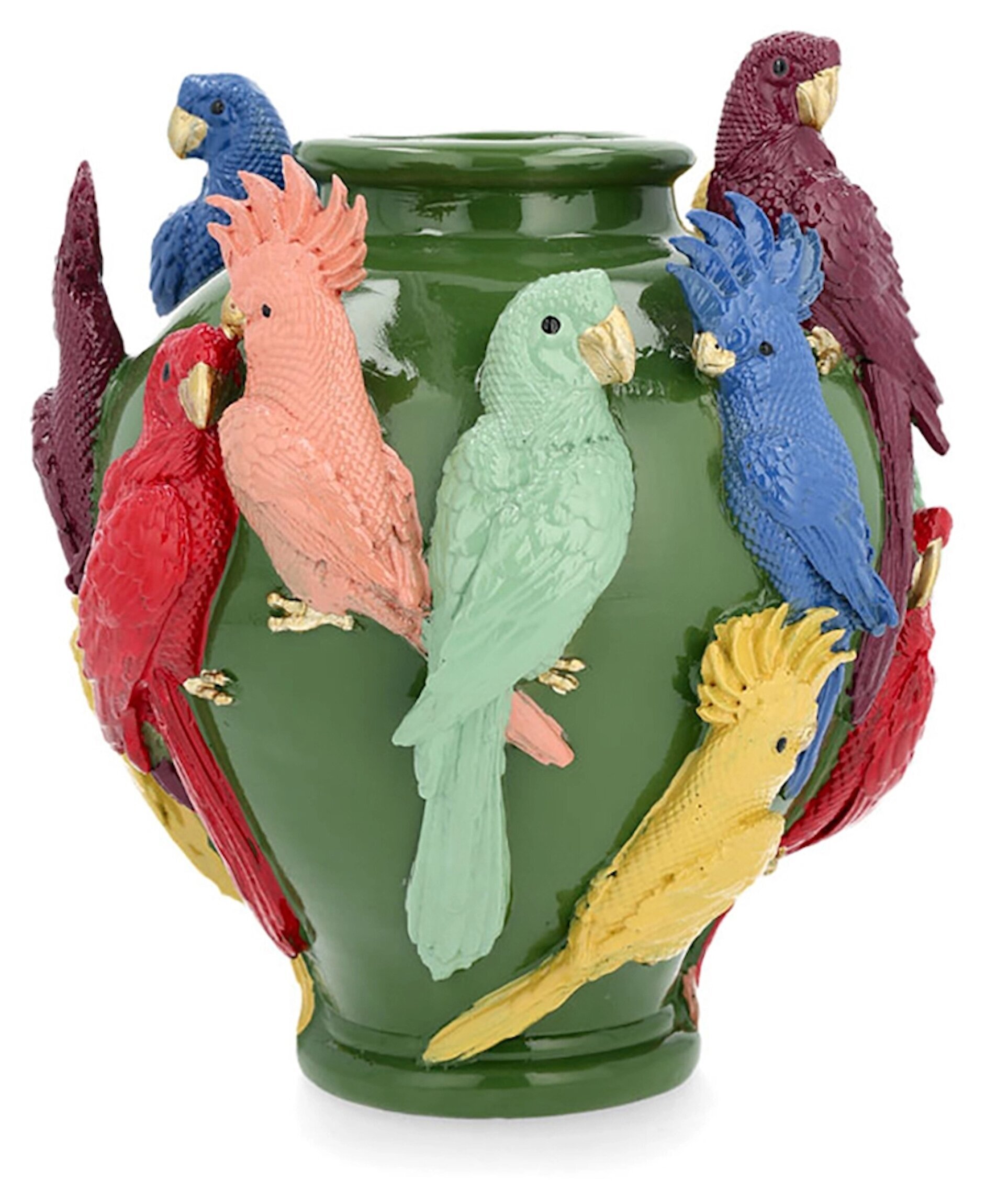En färgstark och dekorativ vas prydd med vackra papegojor runt hela formen. De detaljrika fåglarna i olika färger skapar ett livfullt och lekfullt uttryck som gör vasen till en riktig blickfångare i rummet.