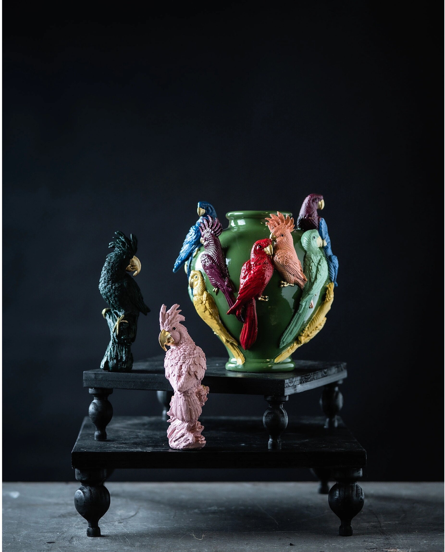 Den djupa gröna basen ger en fin kontrast till de färgglada papegojorna och ger vasen en exotisk och elegant känsla. Perfekt som en dekorativ detalj på ett bord, en hylla eller i ett stilleben – både med och utan blommor.