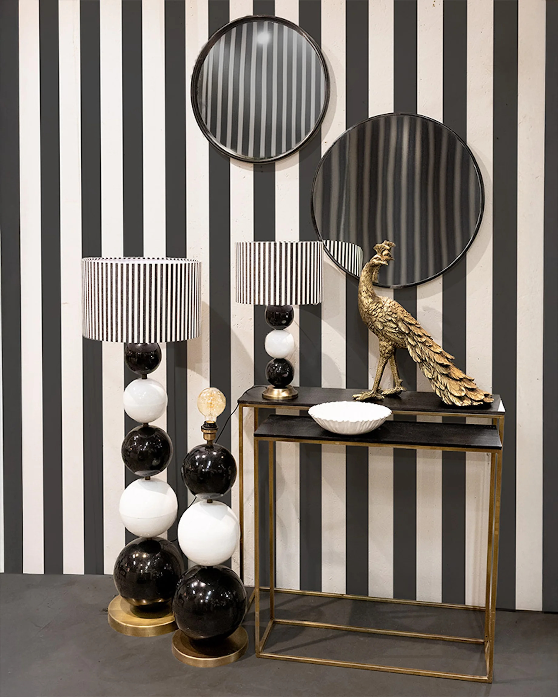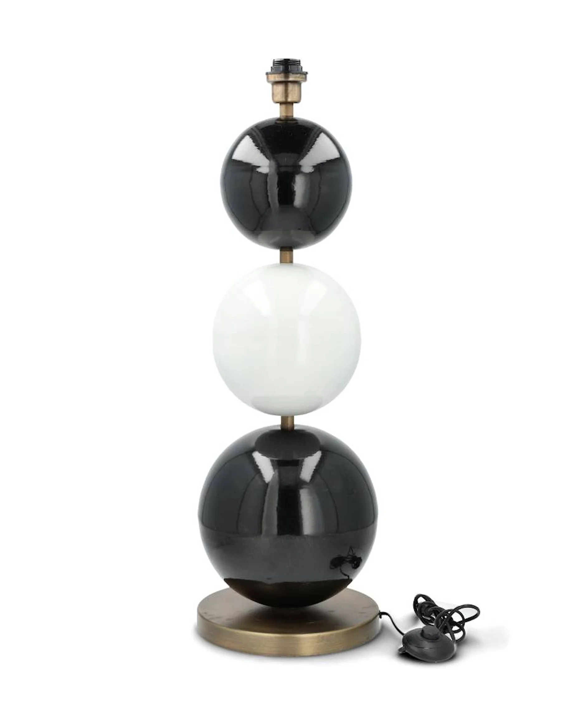 Ge ditt hem en modern och stilfull touch med denna dekorativa lampfot. Den exklusiva designen med tre stora glaserade kulor i svart/vita toner ger ett sofistikerat och konstnärligt intryck. Den stabila foten i mässingsfärgad metall adderar en lyxig känsla och gör att lampan står stadigt. Perfekt för att skapa en varm och inbjudande atmosfär i vardagsrummet, sovrummet eller hallen.