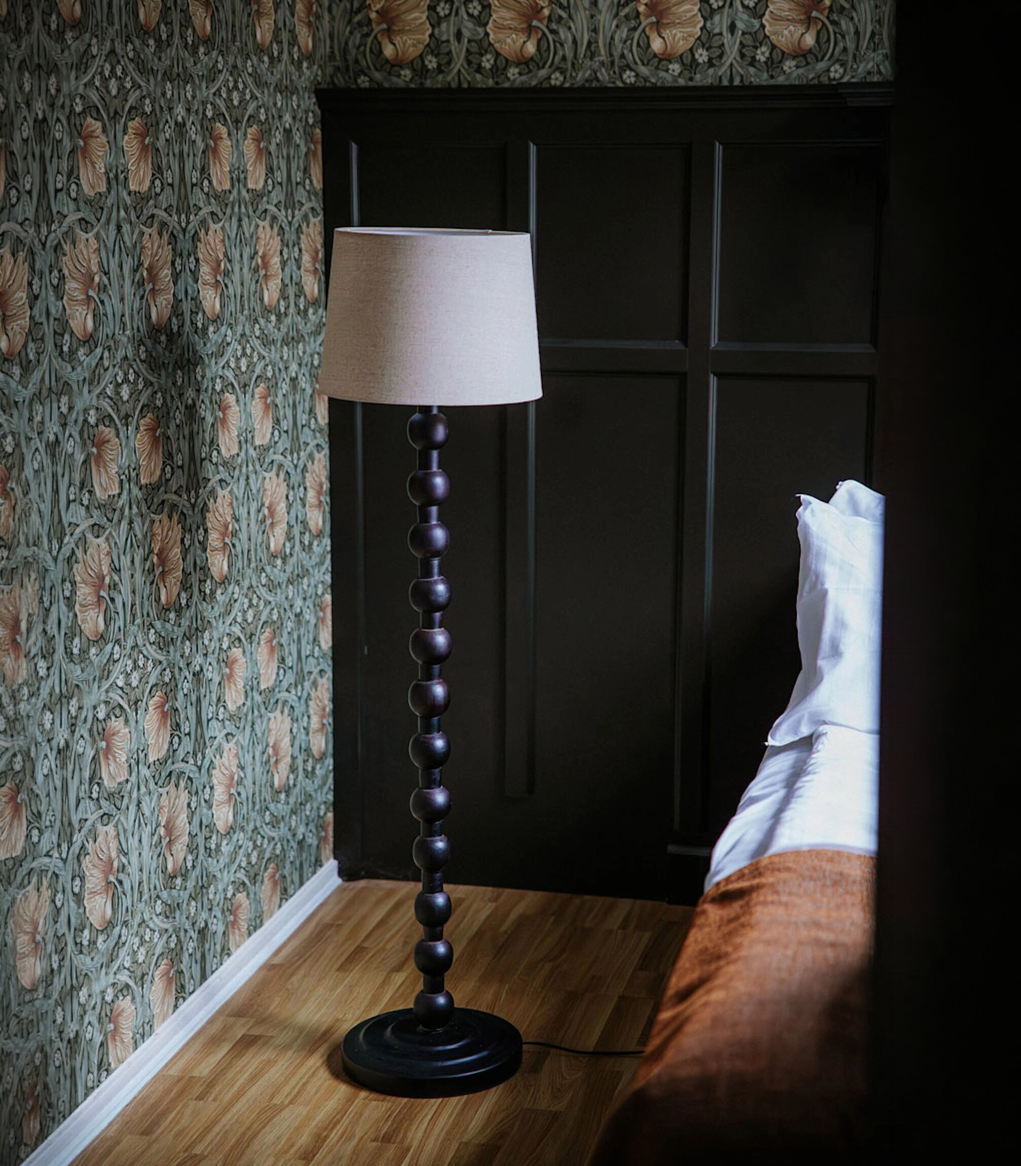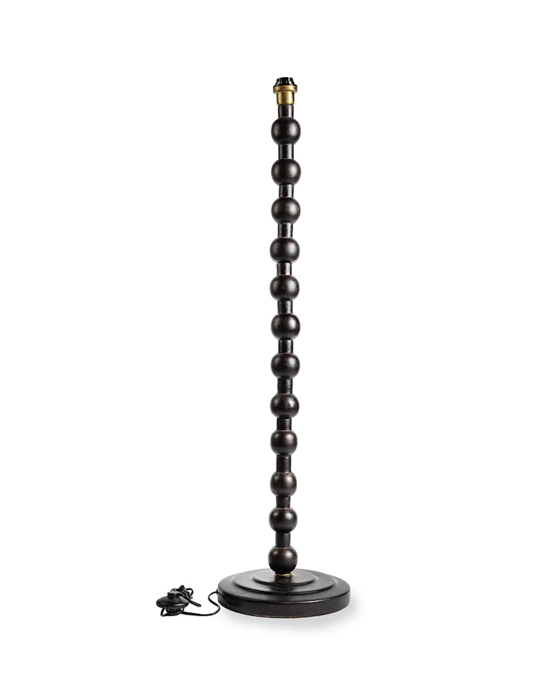 En stilren golvlampa med vackert svarvad fot i trä och dekorativa, mjuka former som ger ett varmt och naturligt uttryck. Den höga modellen gör den perfekt som stämningsfull belysning i vardagsrum, sovrum eller läshörna.