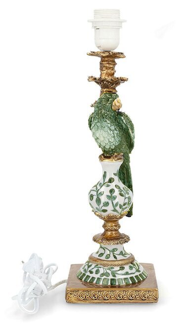 En dekorativ lampfot som kombinerar klassisk elegans med unik charm. Den vackra papegojan i gröna toner vilar på en handmålad fot med fina bladmönster och gyllene detaljer som ger ett exklusivt uttryck. Lampfoten blir ett blickfång i rummet – perfekt på ett sidobord, i sovrummet eller som en elegant detalj i vardagsrummet.