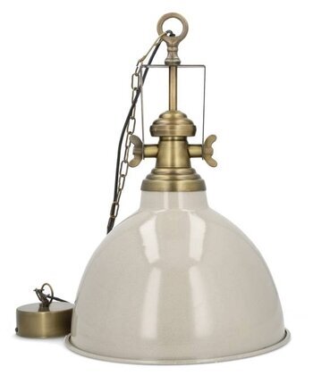 Klassisk taklampa med tidlös design och mjukt rundad form. Den ljusa skärmen kombineras med detaljer i antikmässing som ger ett varmt och gediget uttryck.