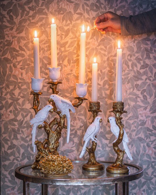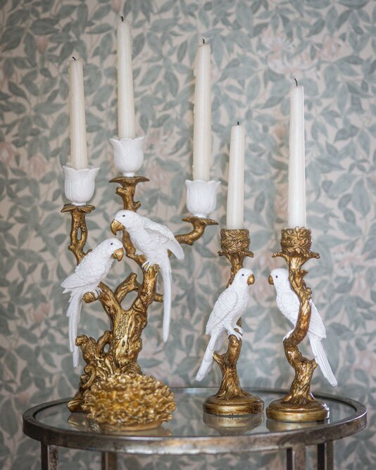 En elegant ljusstake där en vit kakadua sitter stolt på en slingrande gren i antikguld. Kombinationen av den mjukt vita fågeln och den varma guldfärgen skapar ett harmoniskt och exklusivt uttryck.