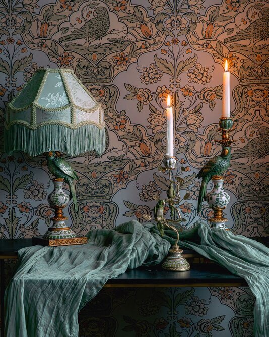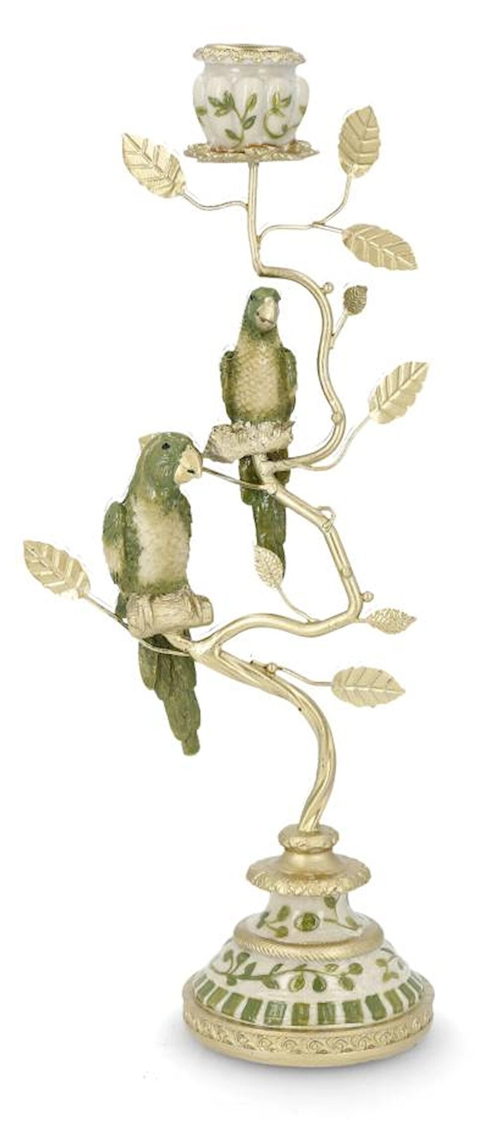 En elegant och detaljrik ljusstake där två papegojor sitter på en slingrande gren med dekorativa blad. Den mjuka färgskalan i grönt och guld ger ett harmoniskt och exklusivt intryck.