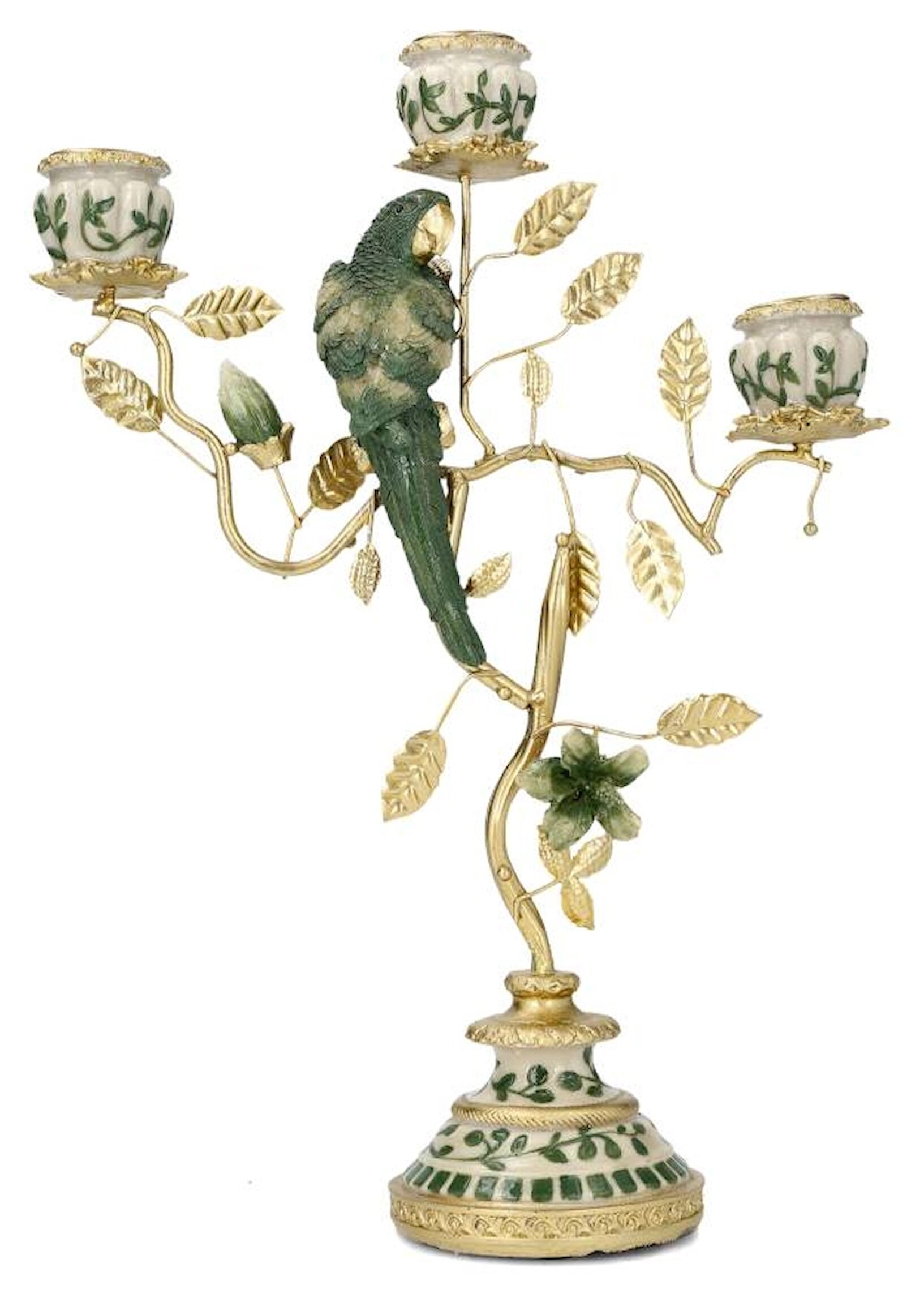 En dekorativ och karaktärsfull ljusstake som drar blickarna till sig. Med sina eleganta grenar, vackra blad och den detaljrika papegojan blir den både en ljusstake och en inredningsdetalj i ett. De mjuka gröna tonerna tillsammans med guldfärgade detaljer ger ett exklusivt och varmt uttryck som passar perfekt på ett dukat bord, i ett fönster eller på en byrå.